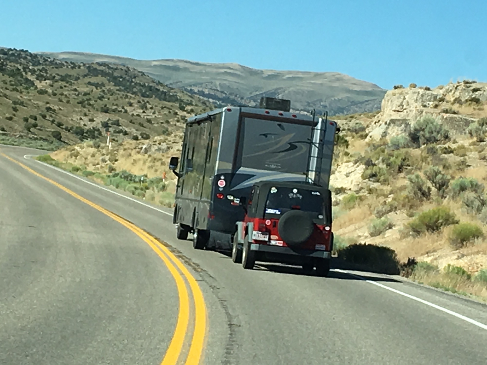 auch vor uns immer eine Augenweite ein Wohnmobil mit seinem kleinen Gefährt im Schlepptau (das war ein kleines Wohnmobil)
