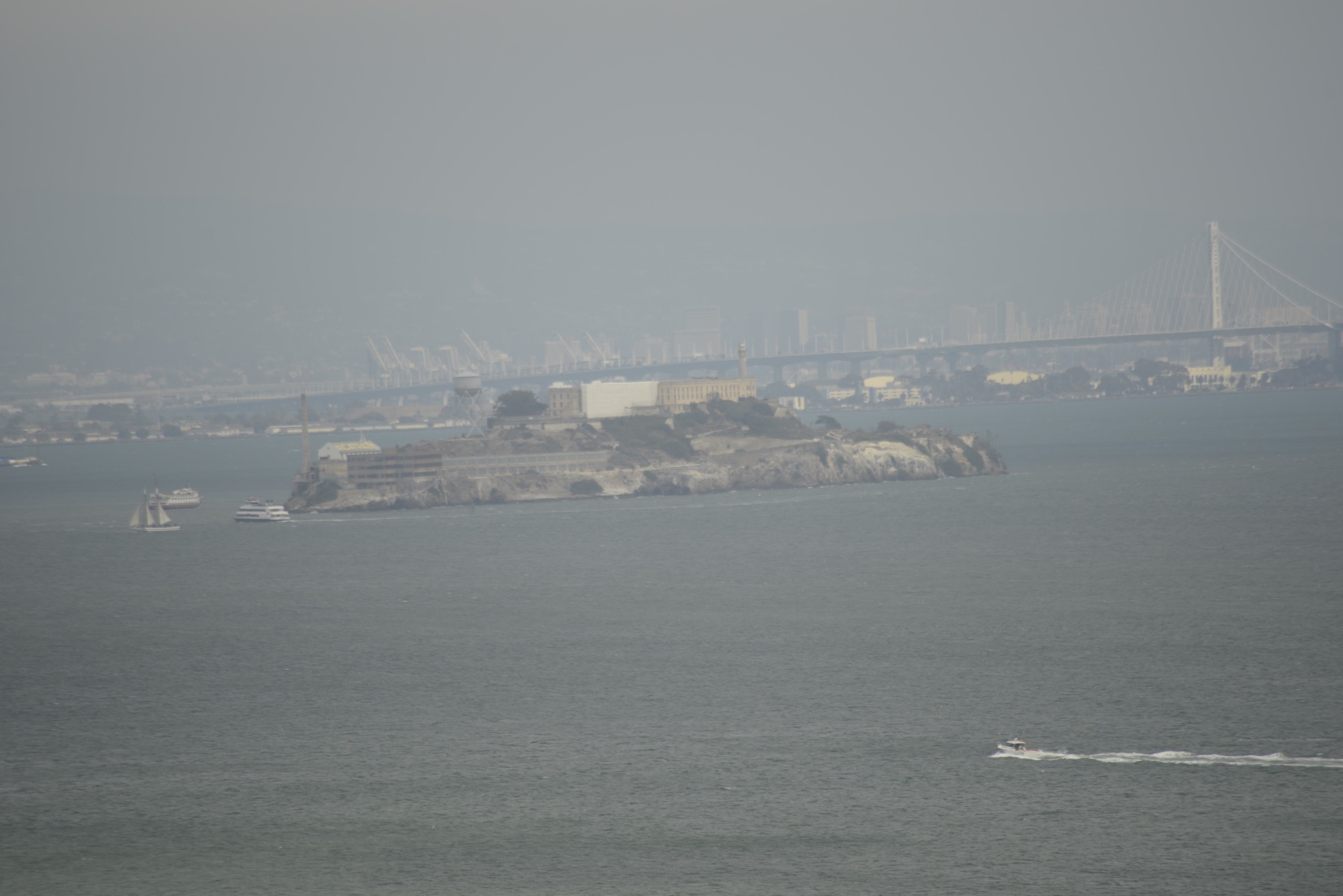 Linker Hand im Hintergrund ist San Francisco zu sehen und im nächsten Bild ist die Ehemalige Gefängnisinsel Alcatraz zu sehen.