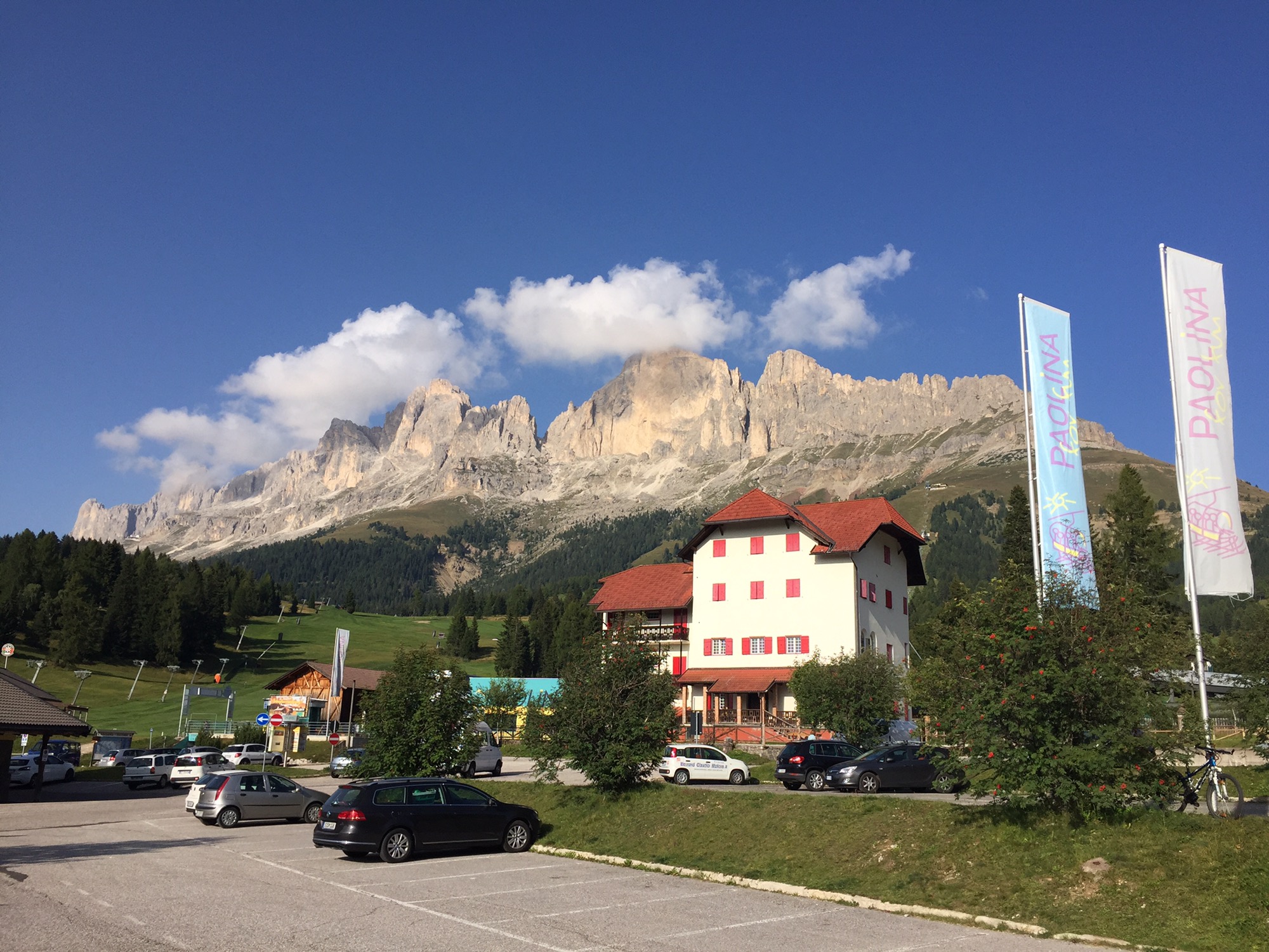 Mit der Sesselbahn hinauf auf zur Rosengartenhütte (Kölner Hütte). Der Ausblick ringsum grandios.