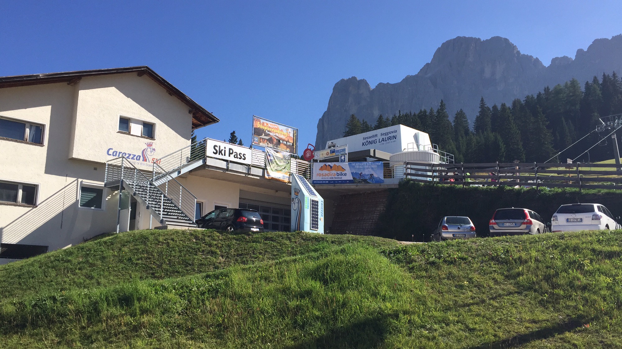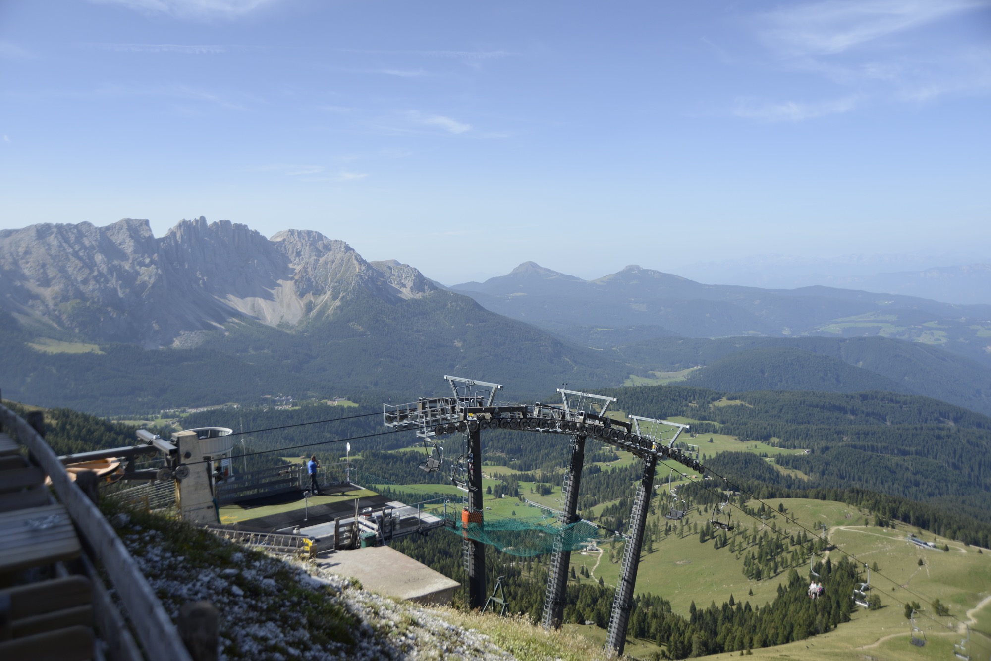 Mit der Sesselbahn hinauf auf zur Rosengartenhütte (Kölner Hütte). Der Ausblick ringsum grandios.