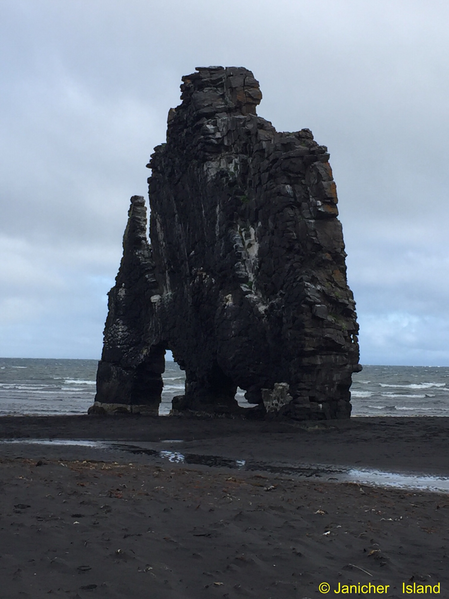 In Hvitserkur angekommen und vom Aussichtspunkt auf den schwarzen Sandstrand hinabgestiegen hat man dann diesen schönen Blick auf diese Gesteinsformationen.