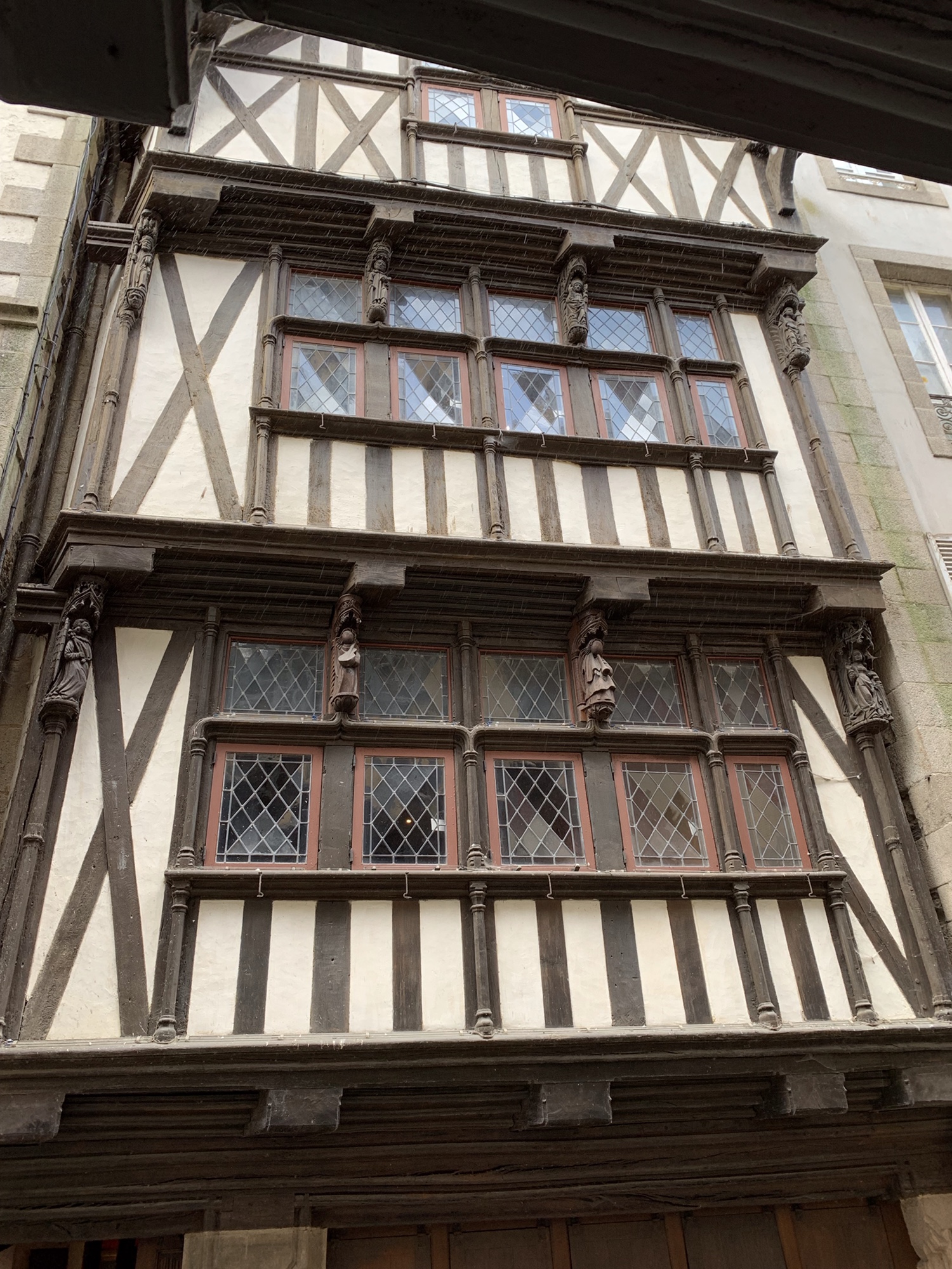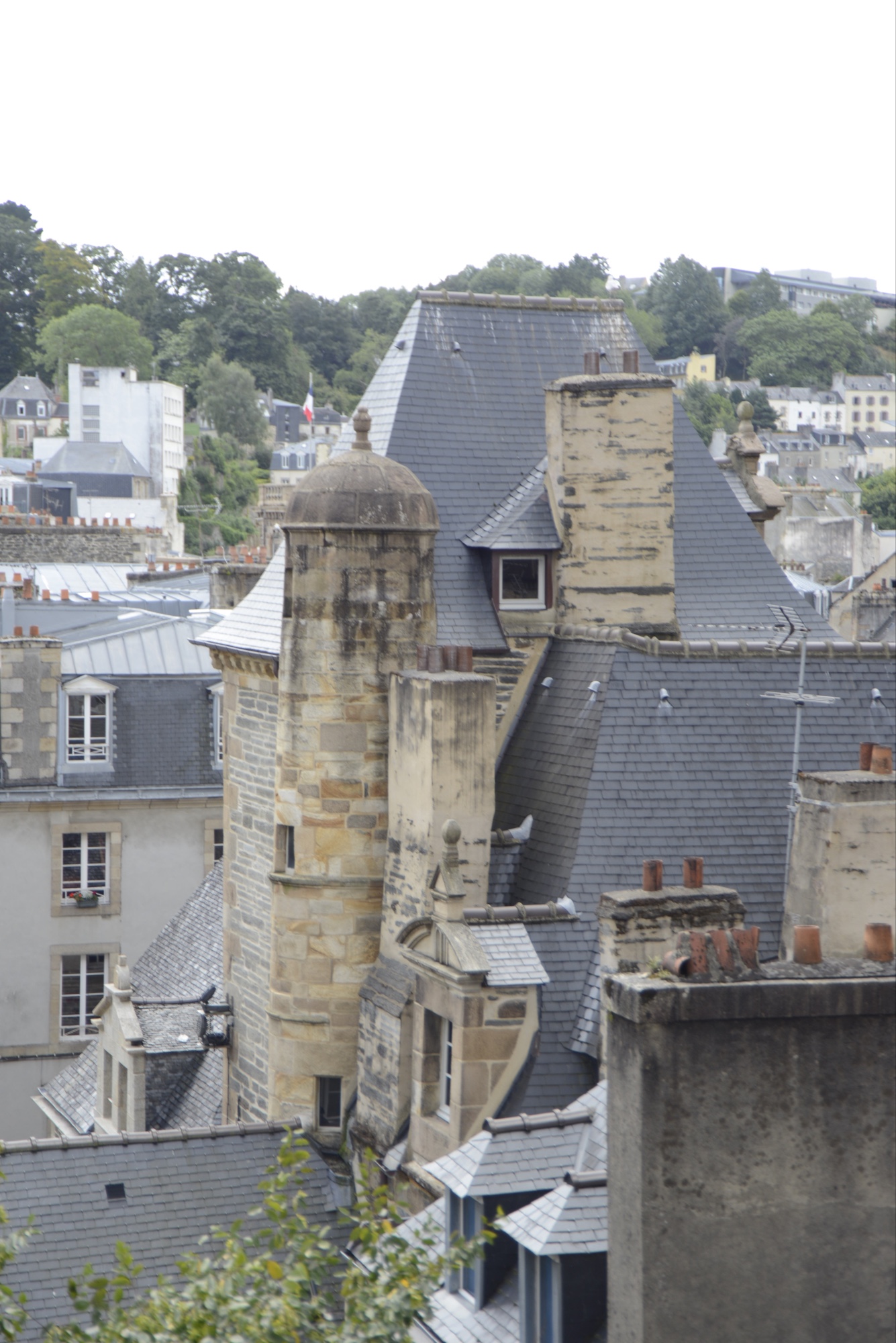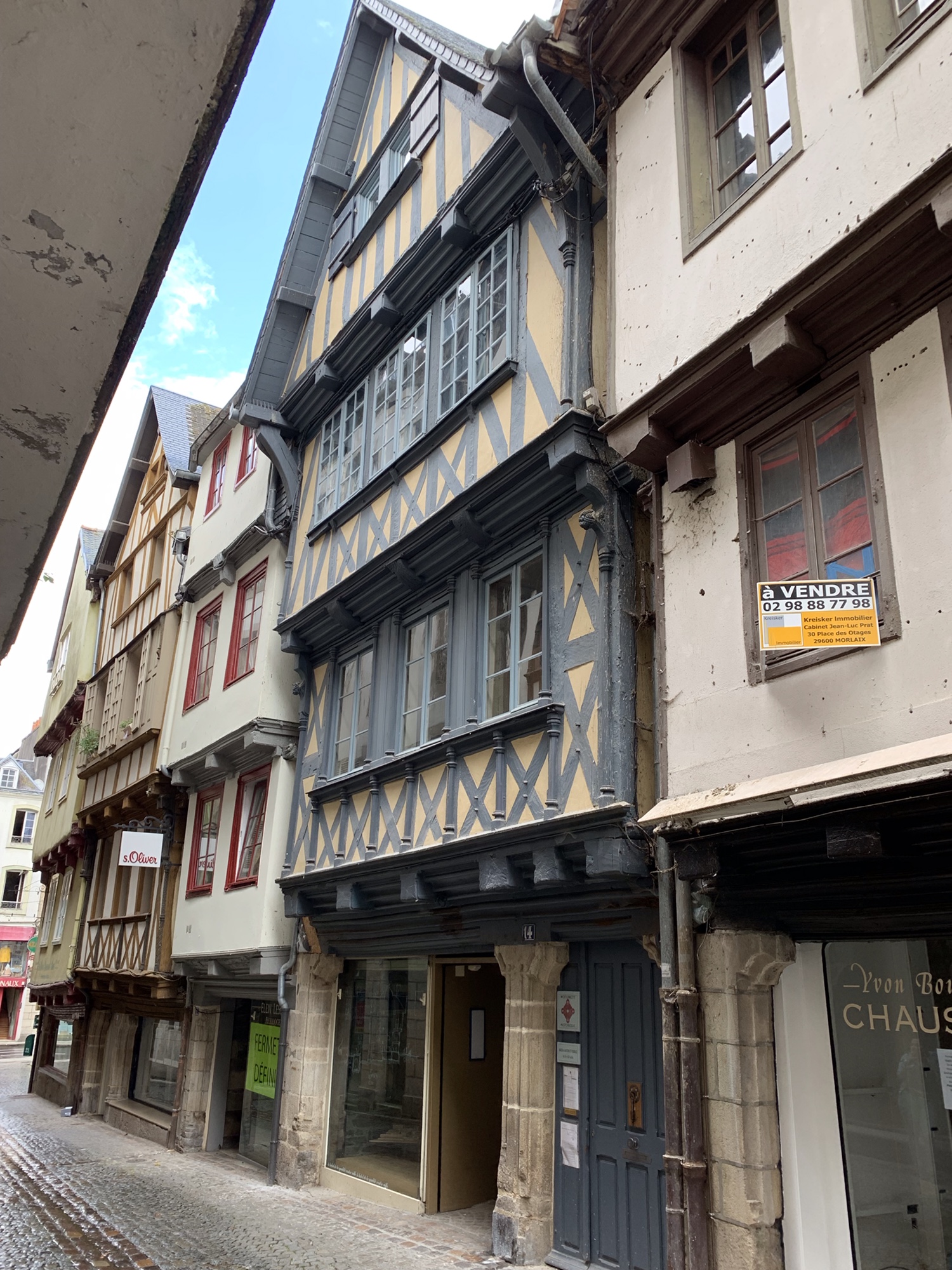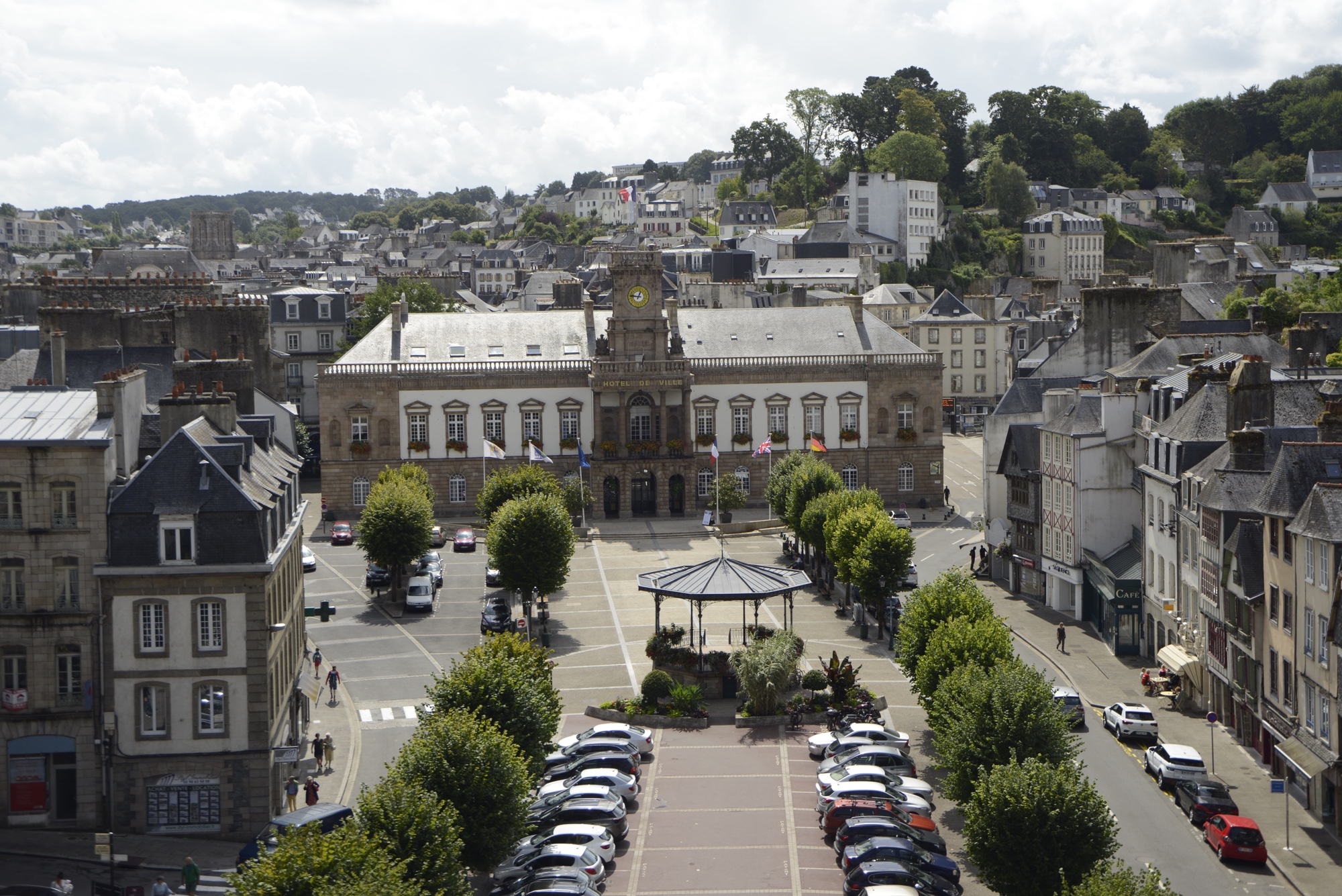 Im Hintergrund das Rathaus von Morlaix. Der dahinter befindliche Platz wurde als „Platz der Geiseln“ getauft. Hintergrund liegt in der Geschichte des zweiten Weltkriegs. Hier haben deutsche Soldaten nach einem Anschlag männliche Bewohner zusammengetrieben und deportiert.