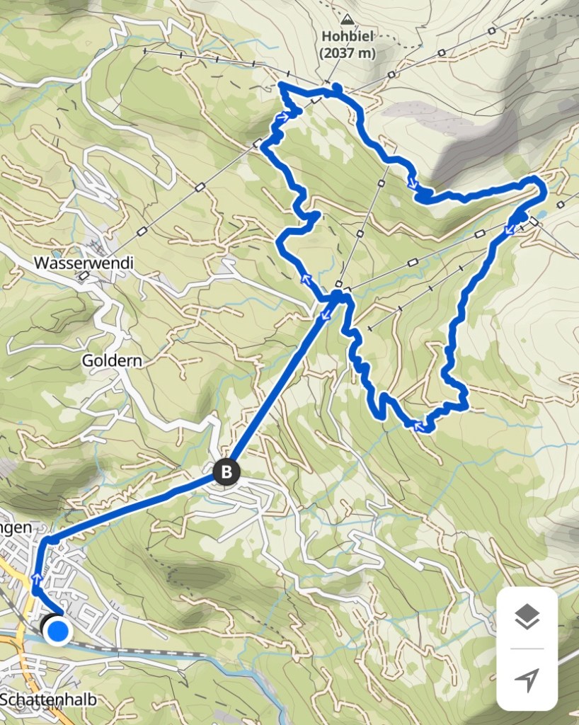 Von Bidmi begann die Wanderung zur Alpe Käserstatt. Man könnte auch mit der Bahn rauffahren, aber wir wollen ja zu Fuß unterwegs sein.