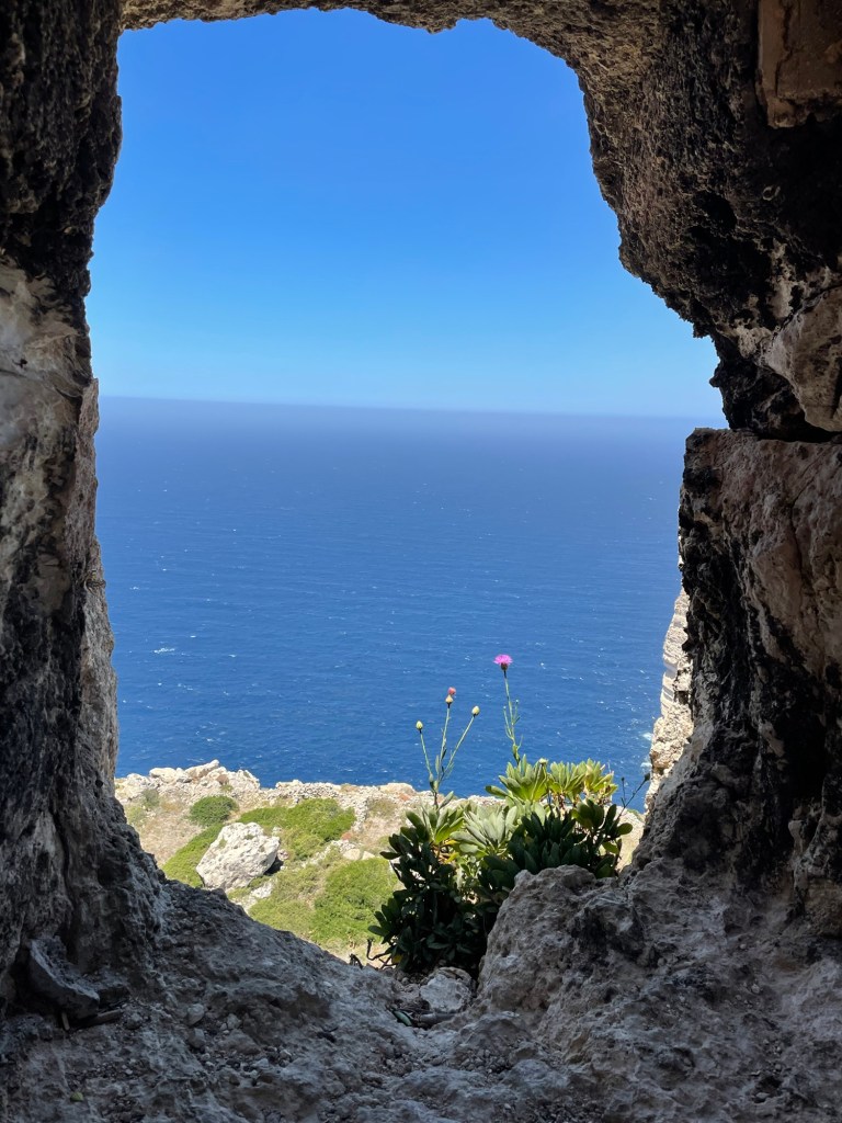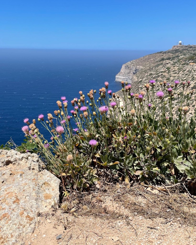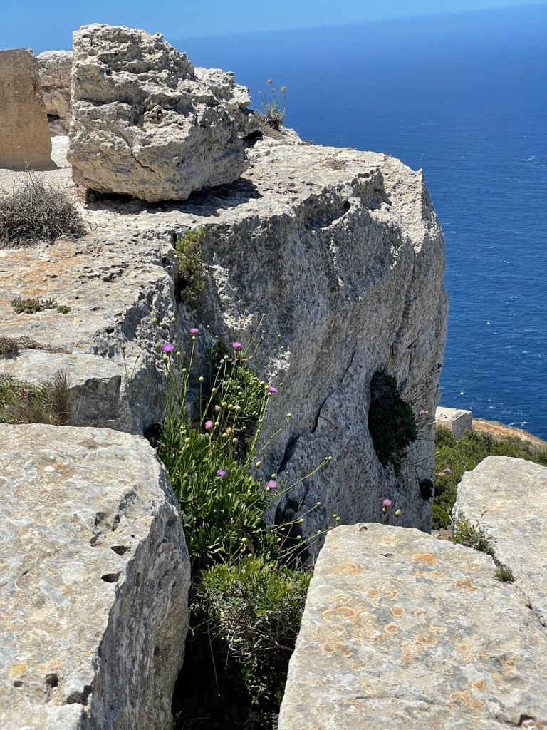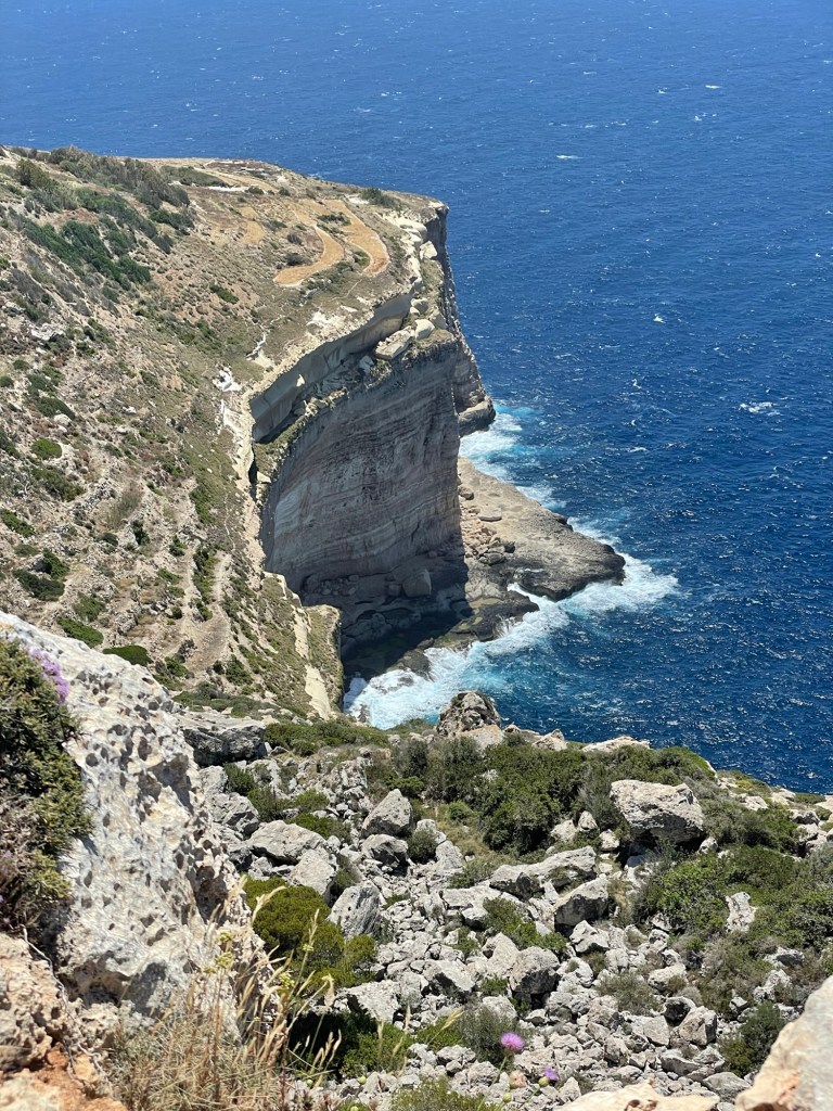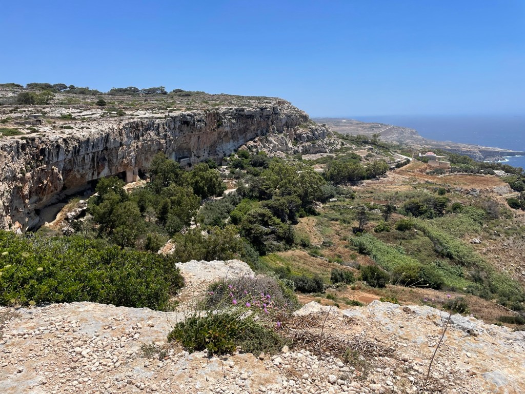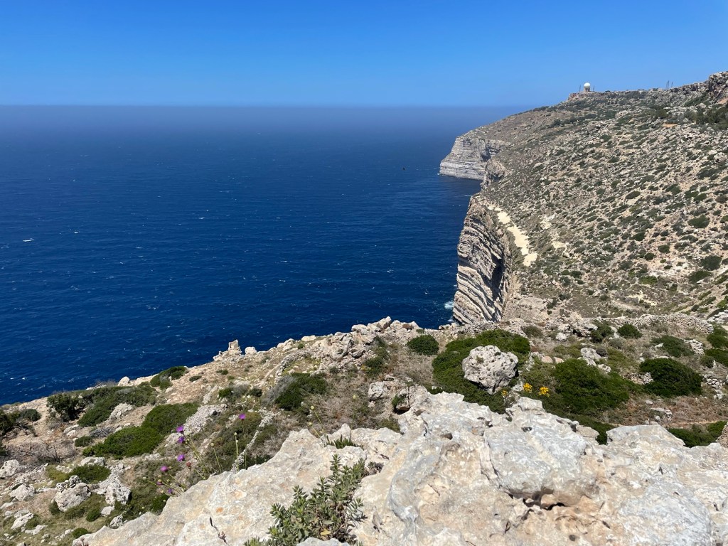 Am oberen Bildrand ist ein ehemaliger Steinbruch der Römer zu erkennen.Teilweise werden die Felsenhöhlen aktuell von Einheimischen zur Lagerung von Gegenständen genutzt.Dingli Cliffs – Runde Kuppel,ist die Radarstation vom Flughafen.