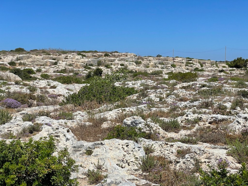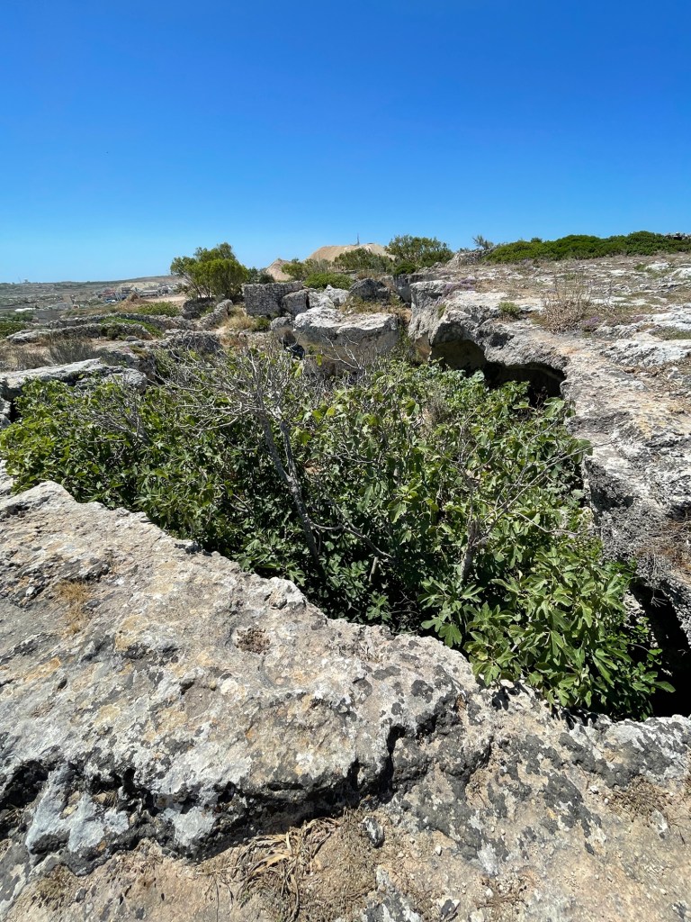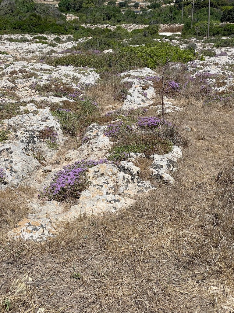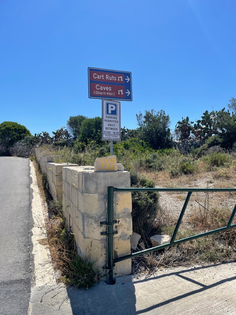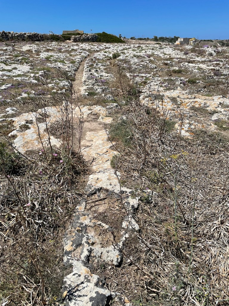 Rundwanderung mit 6,44 km zu den Cart Ruts und dann weiter zu den Dingli Cliffs.Auf dem Weg zu den Cart Ruts steht dieser alte verrostete Jeep.Cart Ruts sind Fahrspuren aus der Zeit vor Christus, als die Bewohner Steine auf diesen Wegen vom Steinbruch zum Ziel transportiert haben.Teilweise etwas schwer zu erkennen; hier quer durchs Bild führen die Spuren.Hier in der Bildmitte besser zu erkennen.Im Boden befindliche Caves (Höhlen).Im Hintergrund der Sommersitz des maltesischen Präsidenten, der auch bei Staatsbesuchen genutzt wird.
