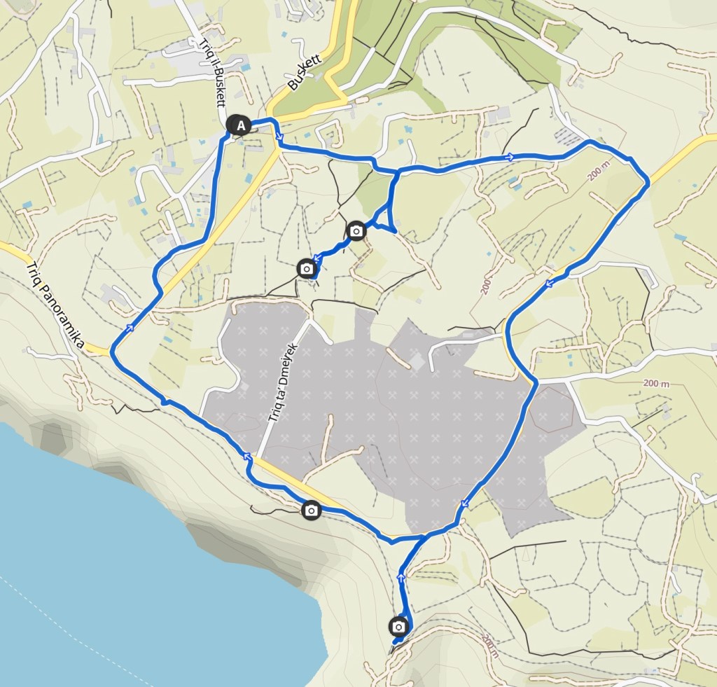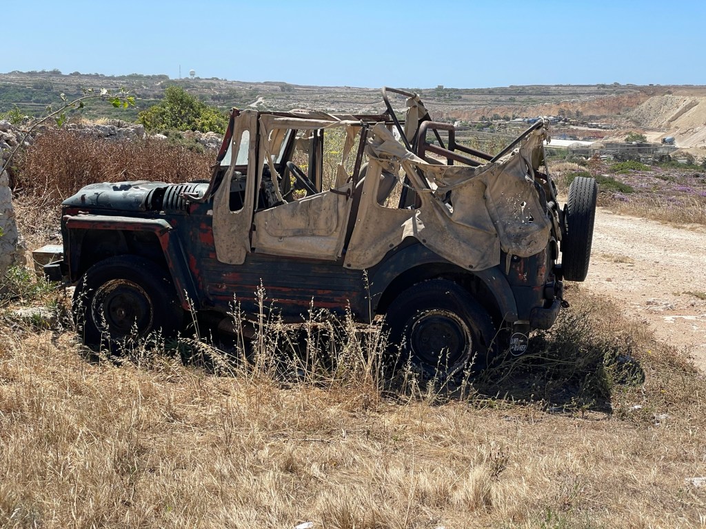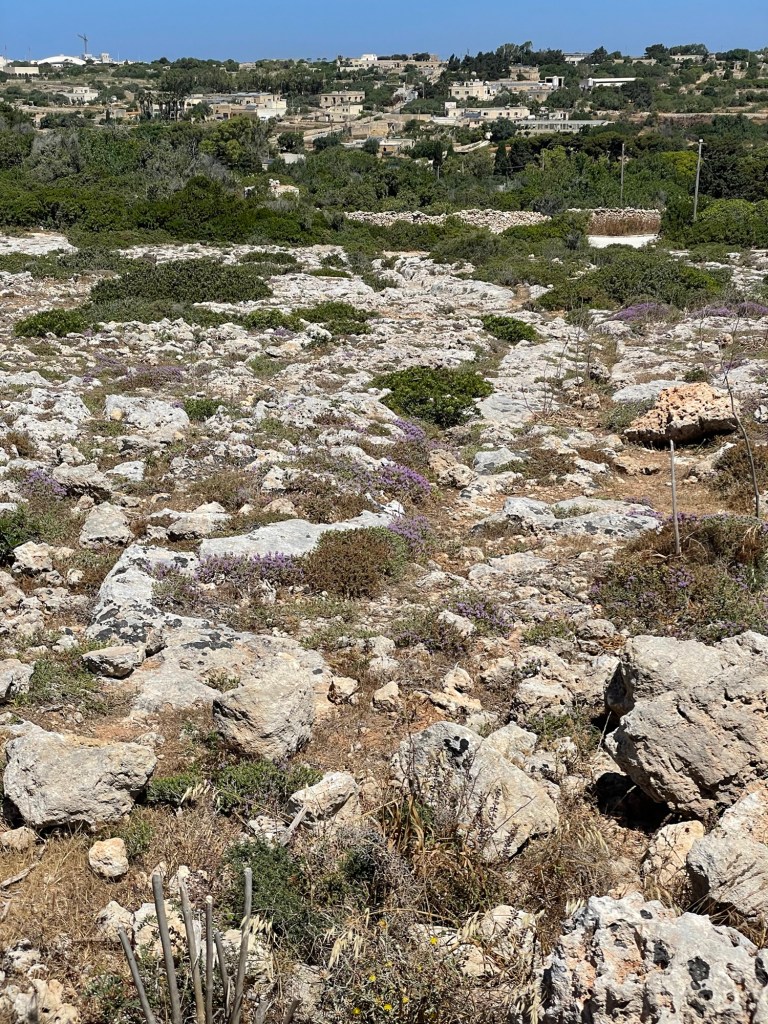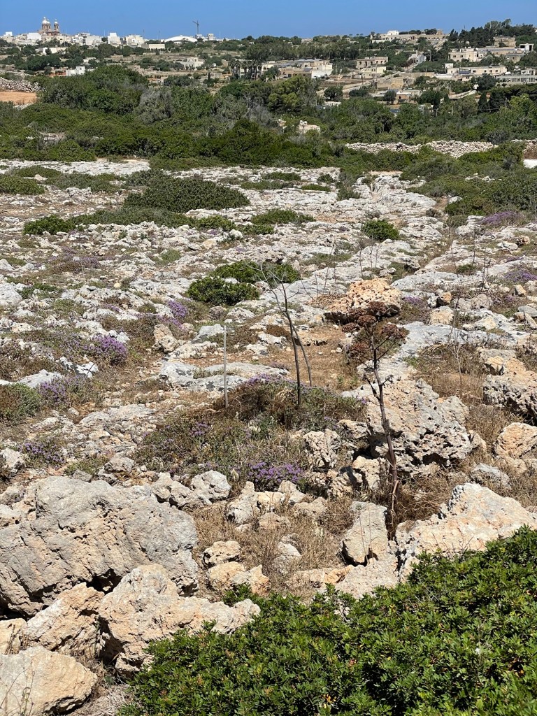 Rundwanderung mit 6,44 km zu den Cart Ruts und dann weiter zu den Dingli Cliffs.Auf dem Weg zu den Cart Ruts steht dieser alte verrostete Jeep.Cart Ruts sind Fahrspuren aus der Zeit vor Christus, als die Bewohner Steine auf diesen Wegen vom Steinbruch zum Ziel transportiert haben.Teilweise etwas schwer zu erkennen; hier quer durchs Bild führen die Spuren.Hier in der Bildmitte besser zu erkennen.Im Boden befindliche Caves (Höhlen).Im Hintergrund der Sommersitz des maltesischen Präsidenten, der auch bei Staatsbesuchen genutzt wird.