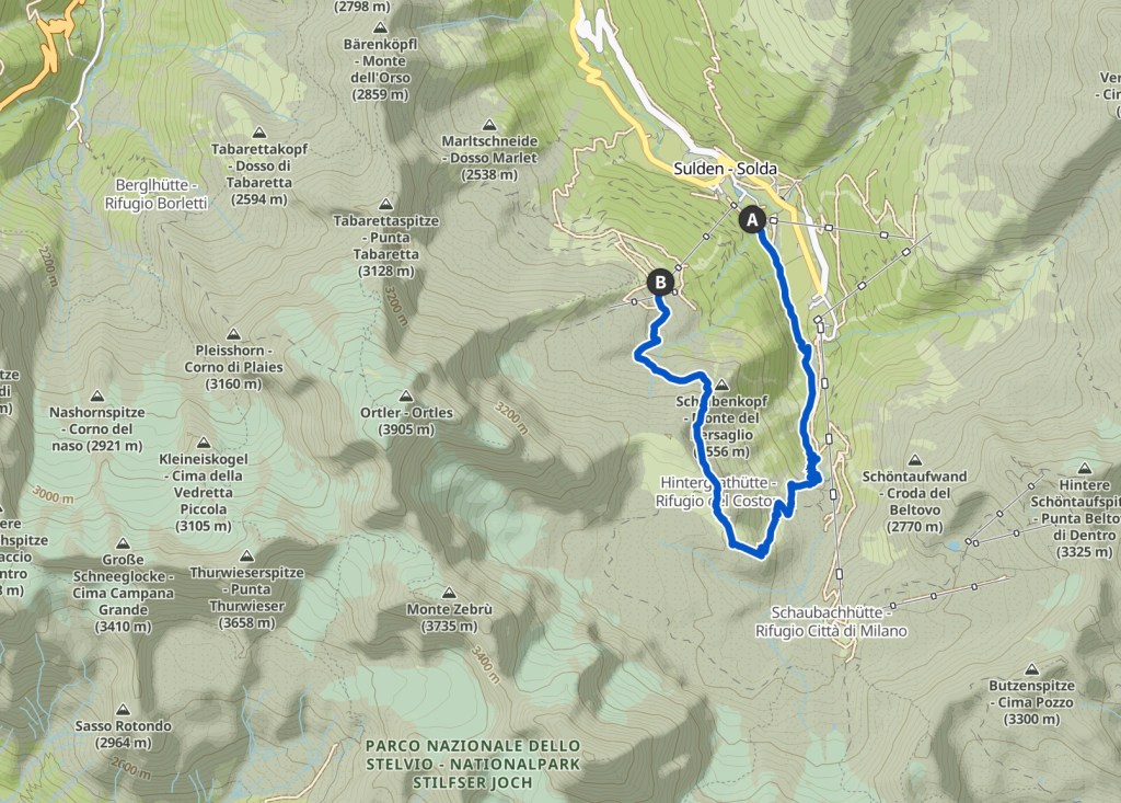 Mit dem Auto von Prad nach Sulden. Parken am Sessellift der Langensteinbahn. Von dort zu Fuß ins Talende.