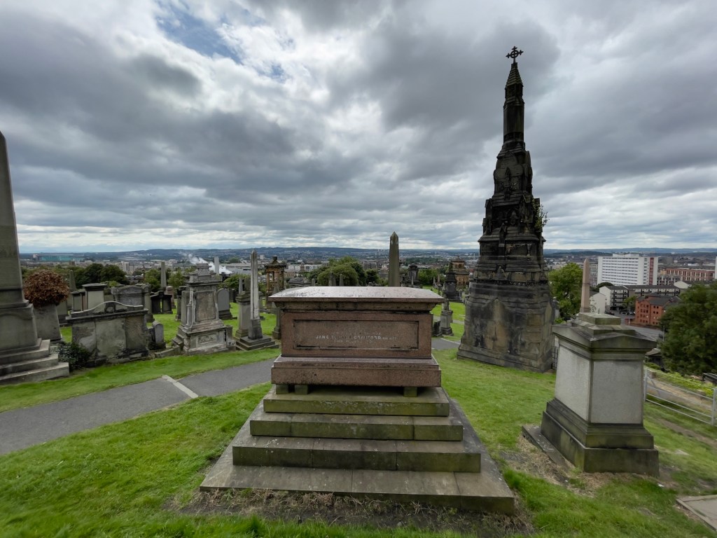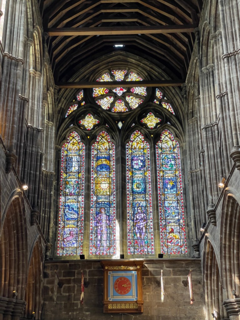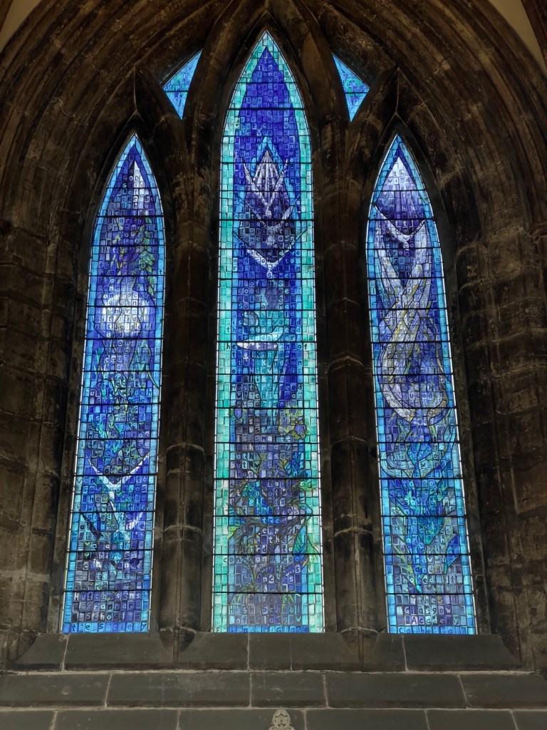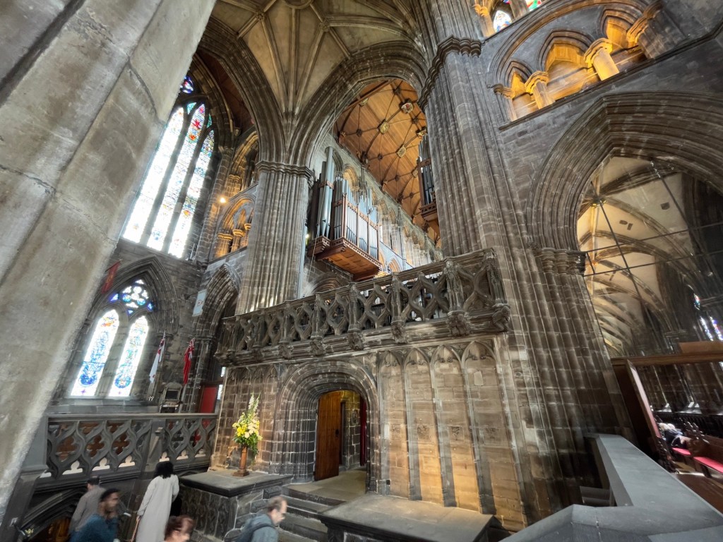 Hauptportal und anschließend ein Rundgang in der Kathedrale vorgenommen.Hauptschiff Fenster über Haupteingang „Die Schöpfung“Plätze für den König und KöniginOriginal Holztüre aus dem 15. JahrhundertAnschließend geht’s auf den Glasgow Necropolis mit diversen Grabdenkmäler und einen sehr interessanten Blick auf Glasgow und auf die Kathedrale.Kathedrale von Glasgow Necropolis gesehen