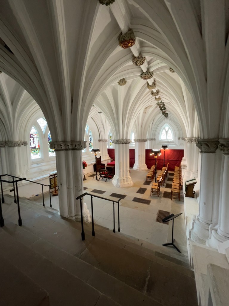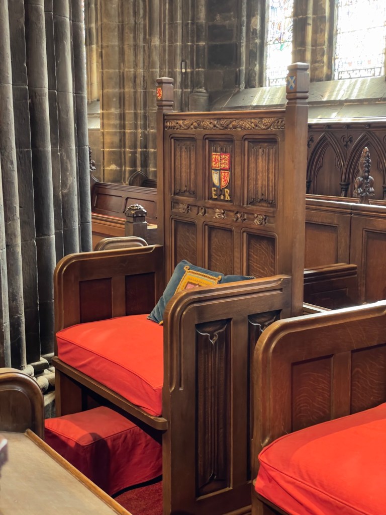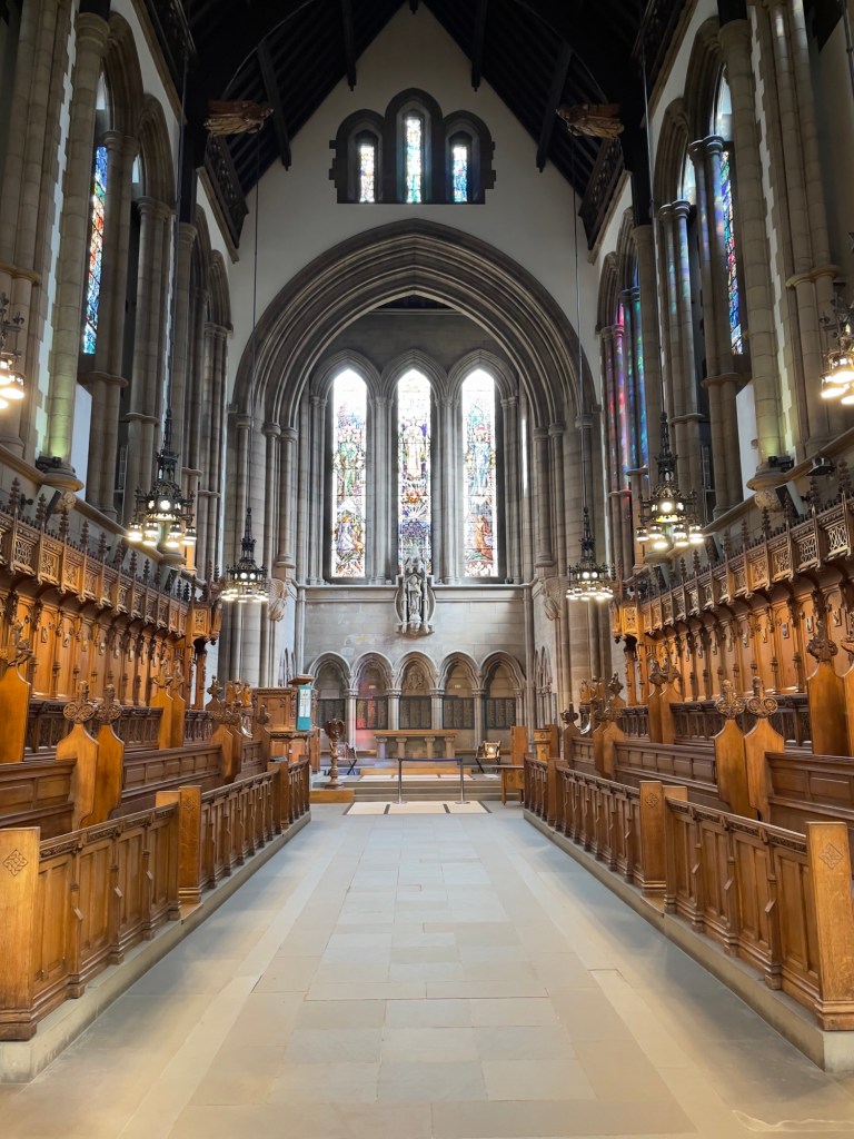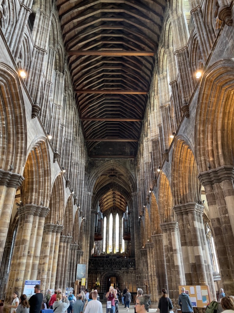 Hauptportal und anschließend ein Rundgang in der Kathedrale vorgenommen.Hauptschiff Fenster über Haupteingang „Die Schöpfung“Plätze für den König und KöniginOriginal Holztüre aus dem 15. JahrhundertAnschließend geht’s auf den Glasgow Necropolis mit diversen Grabdenkmäler und einen sehr interessanten Blick auf Glasgow und auf die Kathedrale.Kathedrale von Glasgow Necropolis gesehen