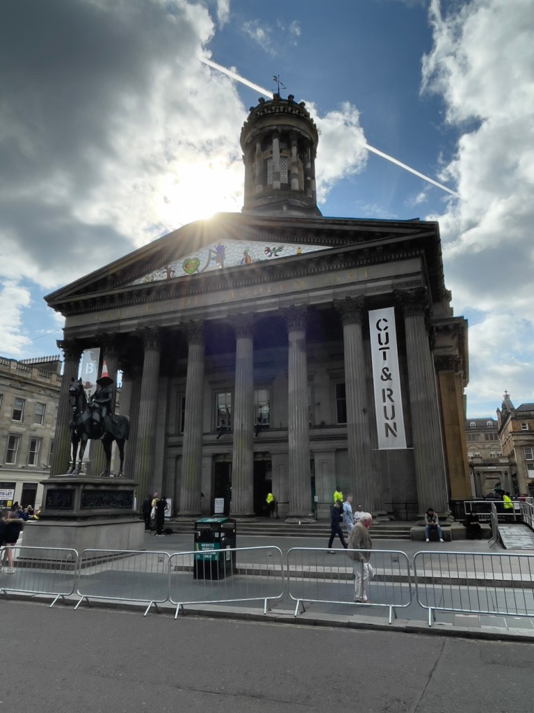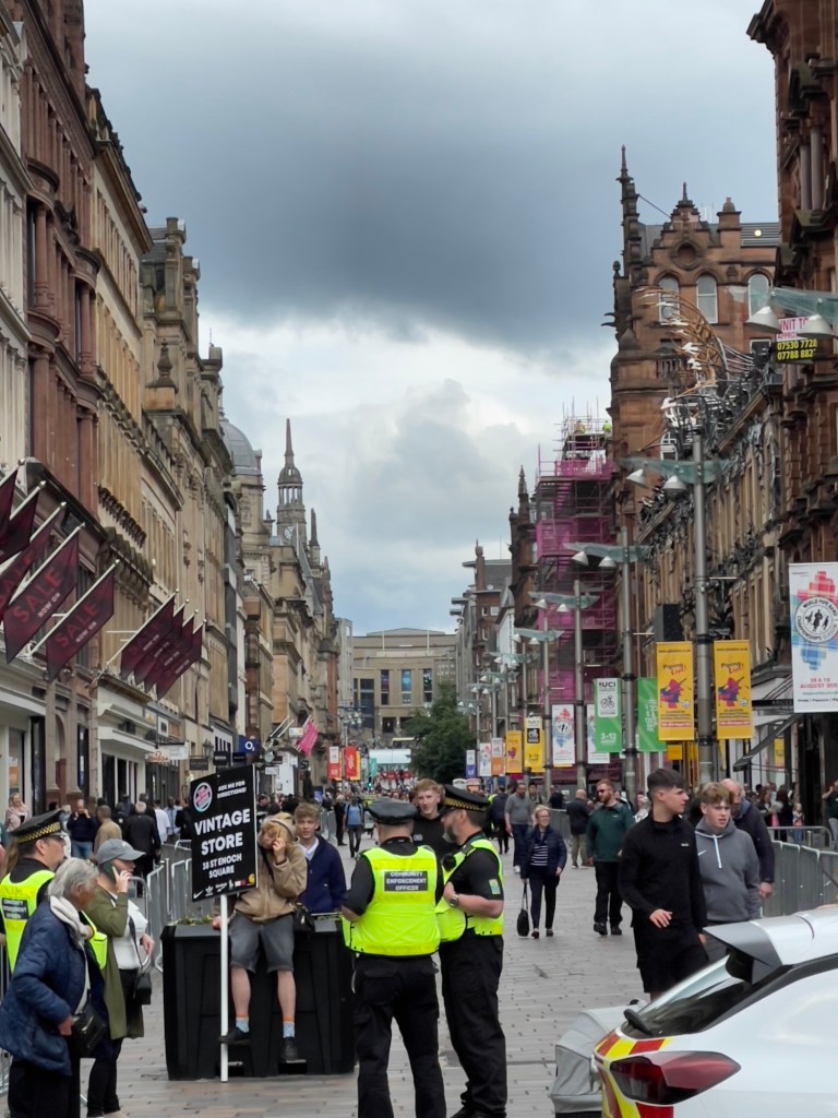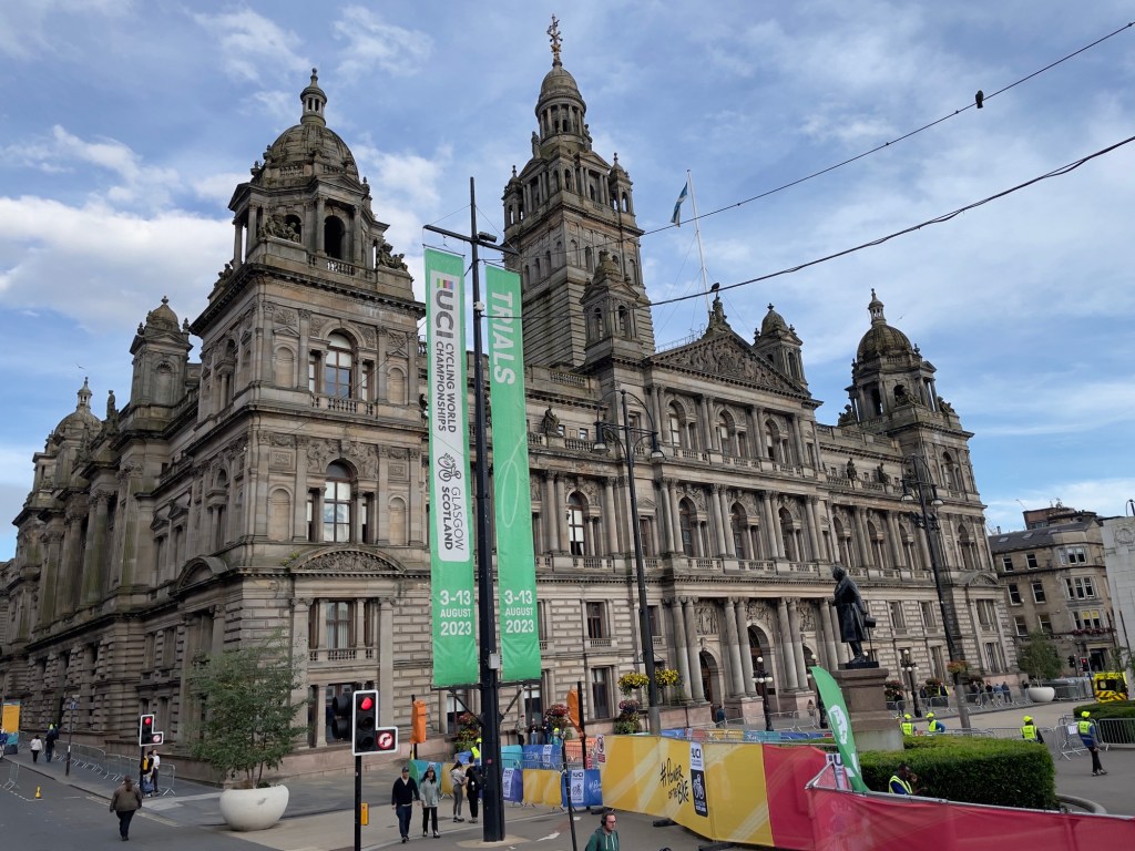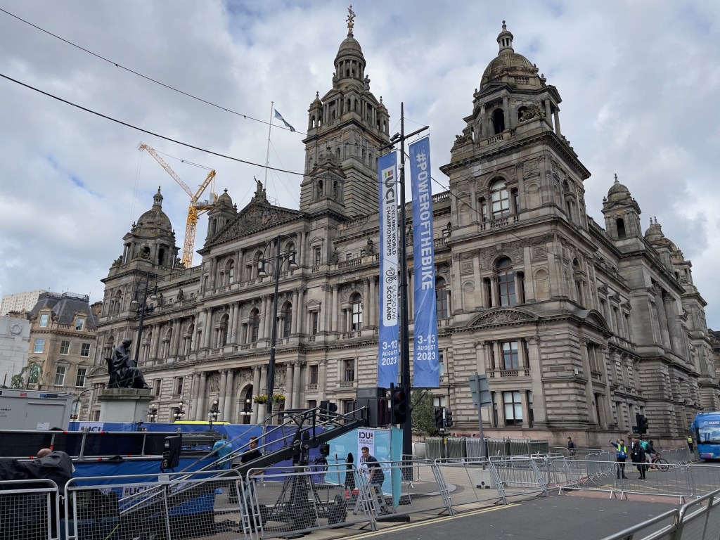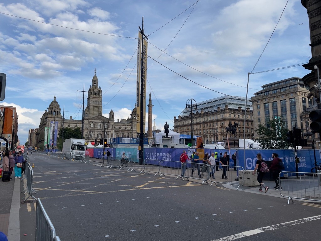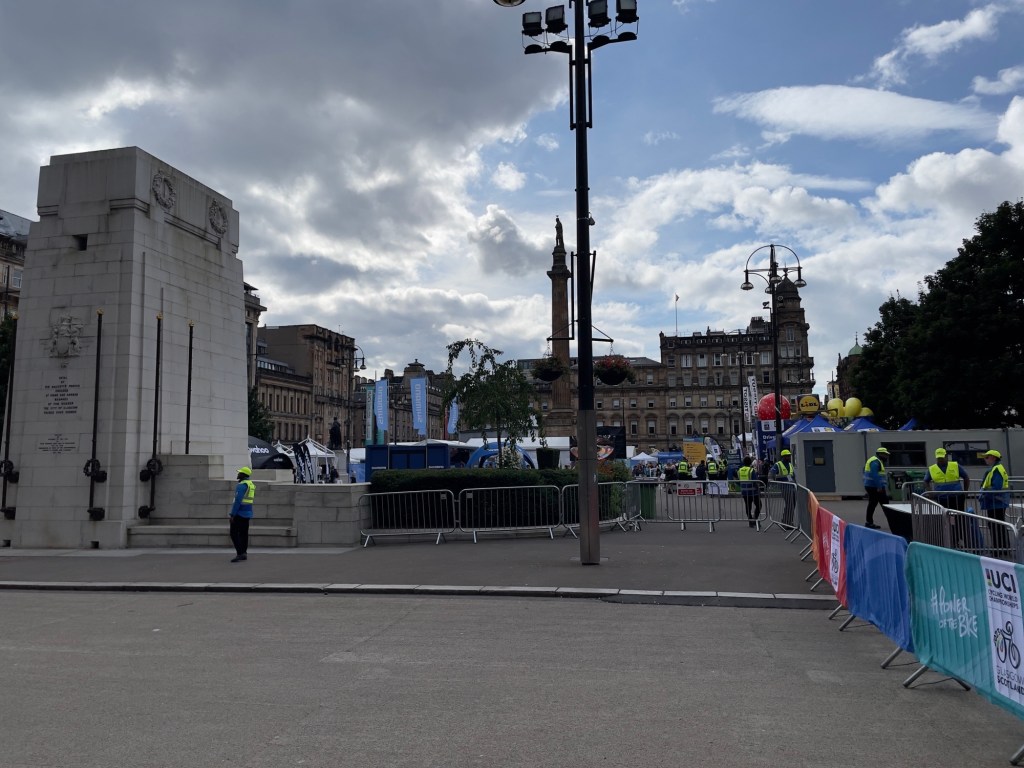 Zurück am ‚George Square‘, der heute komplett für den anstehende Veranstaltungsmarathon UCI (Radrennen), belegt ist.