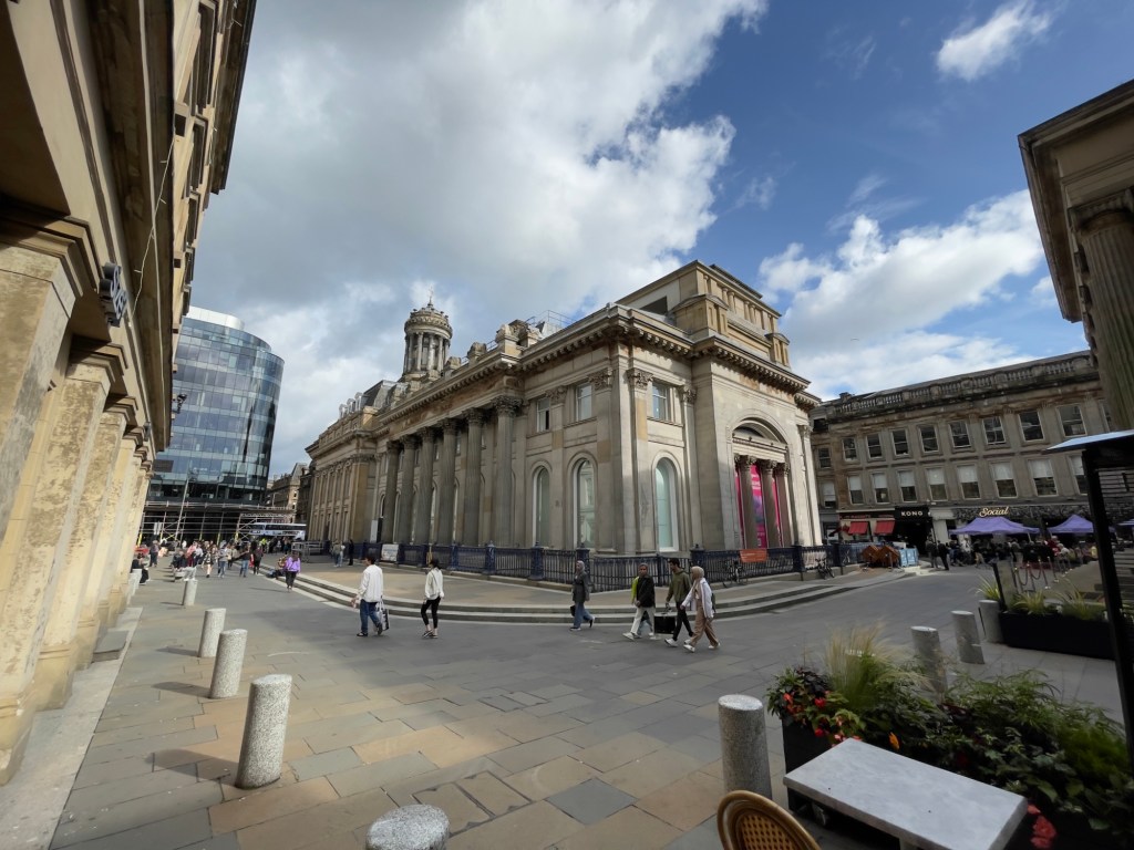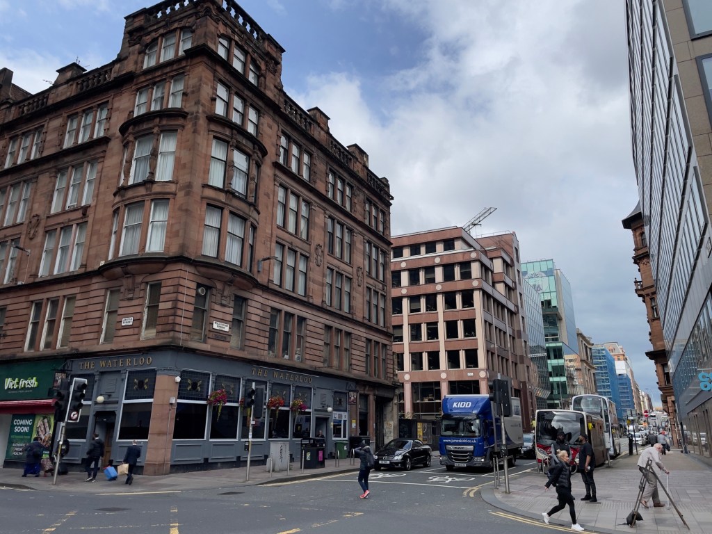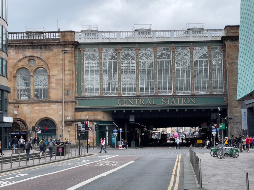 Das einzige was uns gefallen hat, war die Konstruktion aus Metall und Glas und die Beleuchtung.Auf dem Weg zum nächsten Einstieg quer durch die Straßen und Fußgängerzone.Auch die Beatles waren anwesend und gaben was zum Besten.Glasgow Central ist der größere der beiden Hauptbahnhöfe der britischen Stadt Glasgow. Er ist der größte Bahnhof in Schottland und Endstation der Hauptstrecke West Coast Main Line.Andere Seite Glasgow Central. Von dort geht’s mit der Tour weiter.Immer alte Häuser und Neubauten