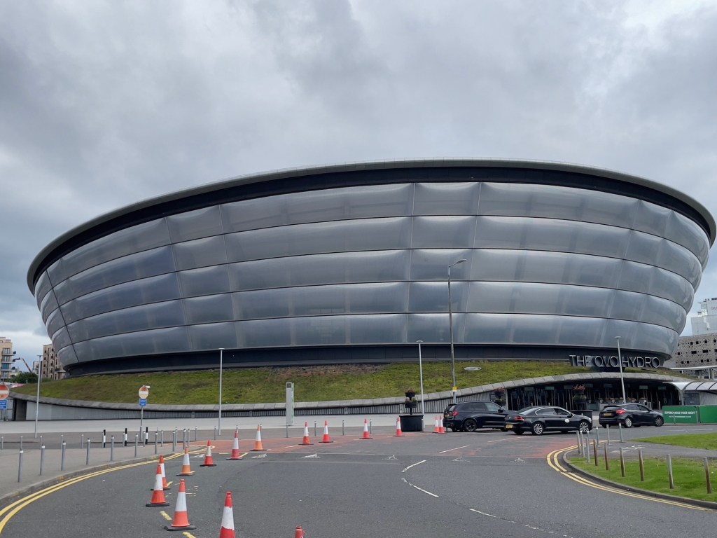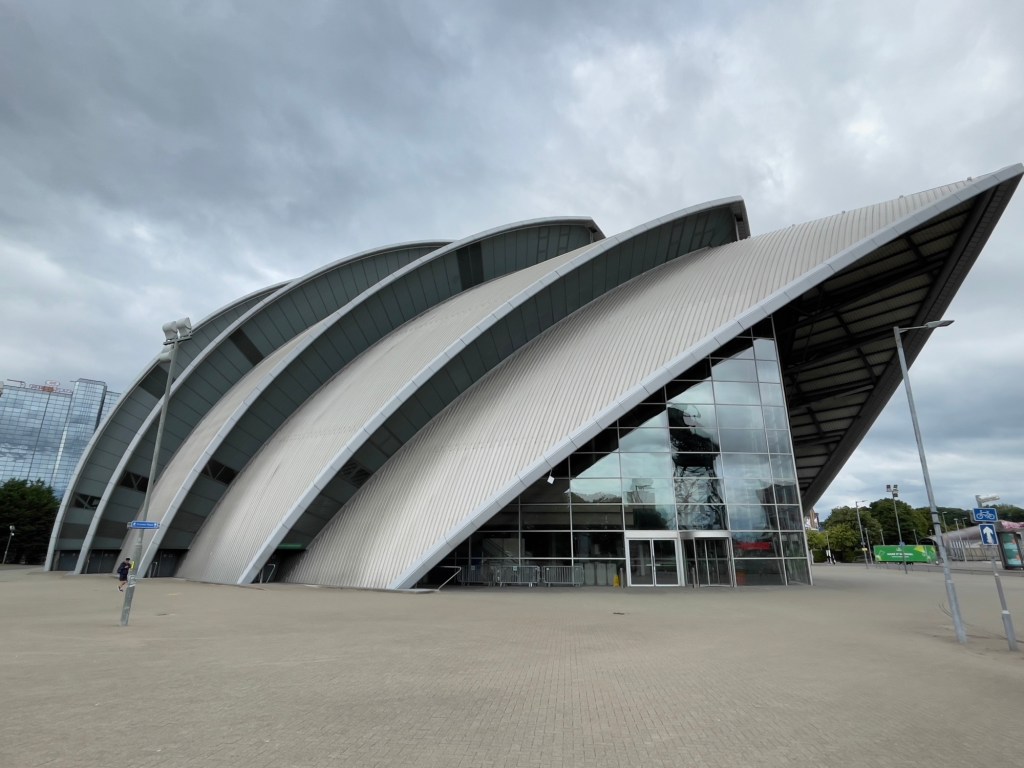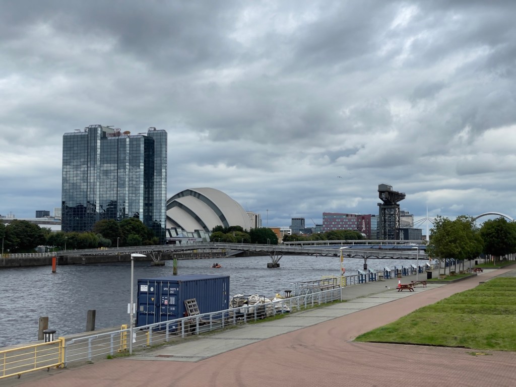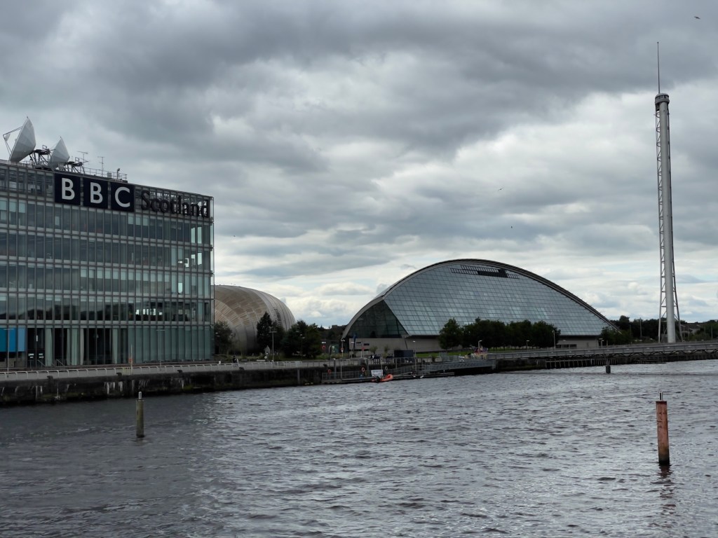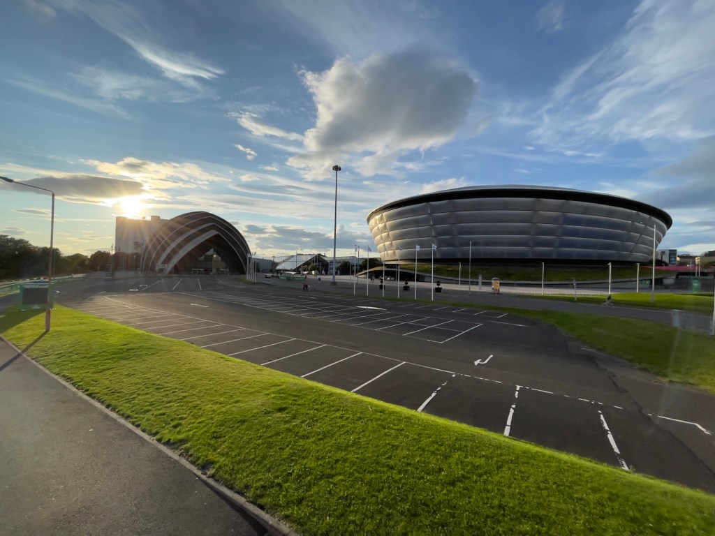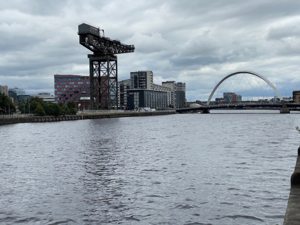 SEC Armadillo – scheint ein kleiner Verwandter aus Down under zu sein 😀Hydro – Veranstaltungstempel. Entworfen von Sir Norman Forster und eingeweiht mit Konzert von Rod Stewart.In der AbendsonneKran aus der goldenen Zeit des Schiffsbaus, jetzt ein Kulturdenkmal.Über den River Clyde zum Glasgow Science Center. Dies sieht aus wie ein Schiffsrumpf. Komplett aus Stahl und Glas. Hier können sich die Kinder vergnügen.