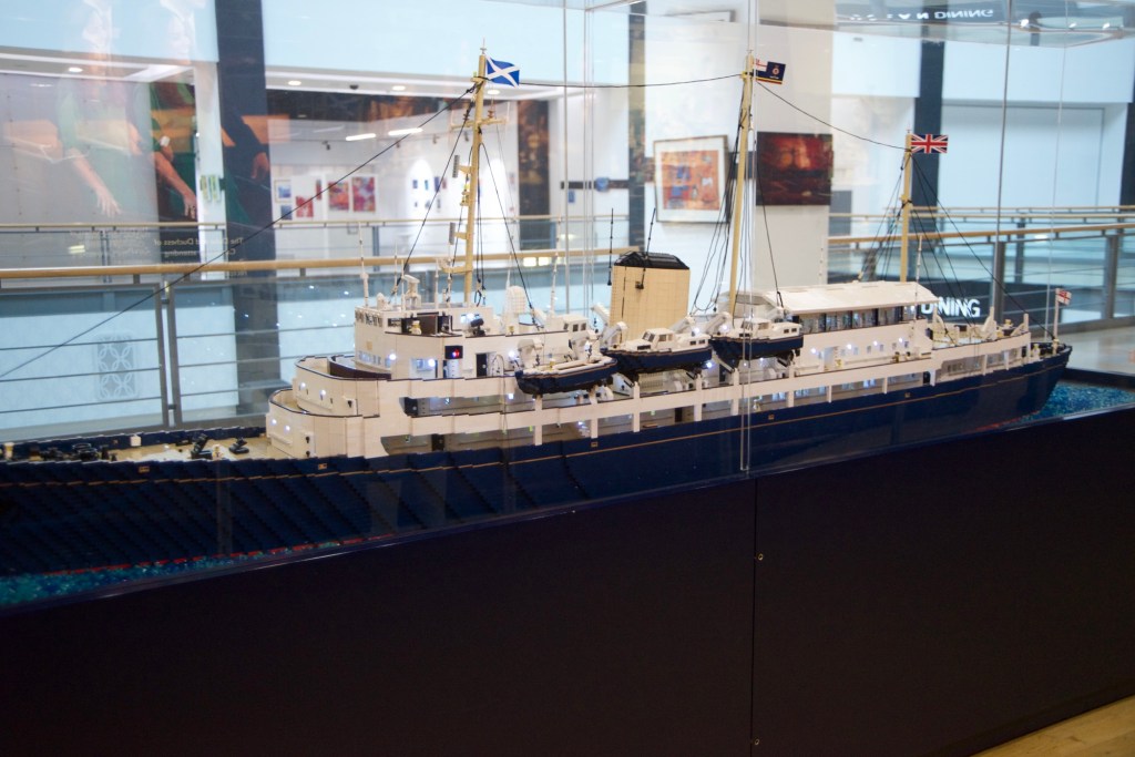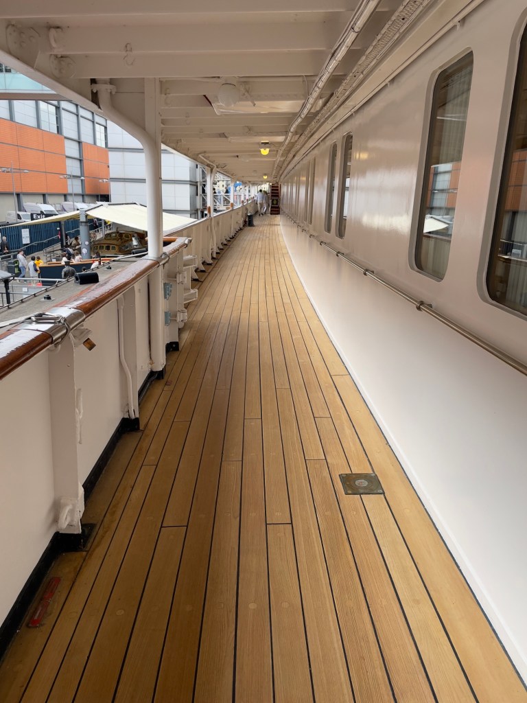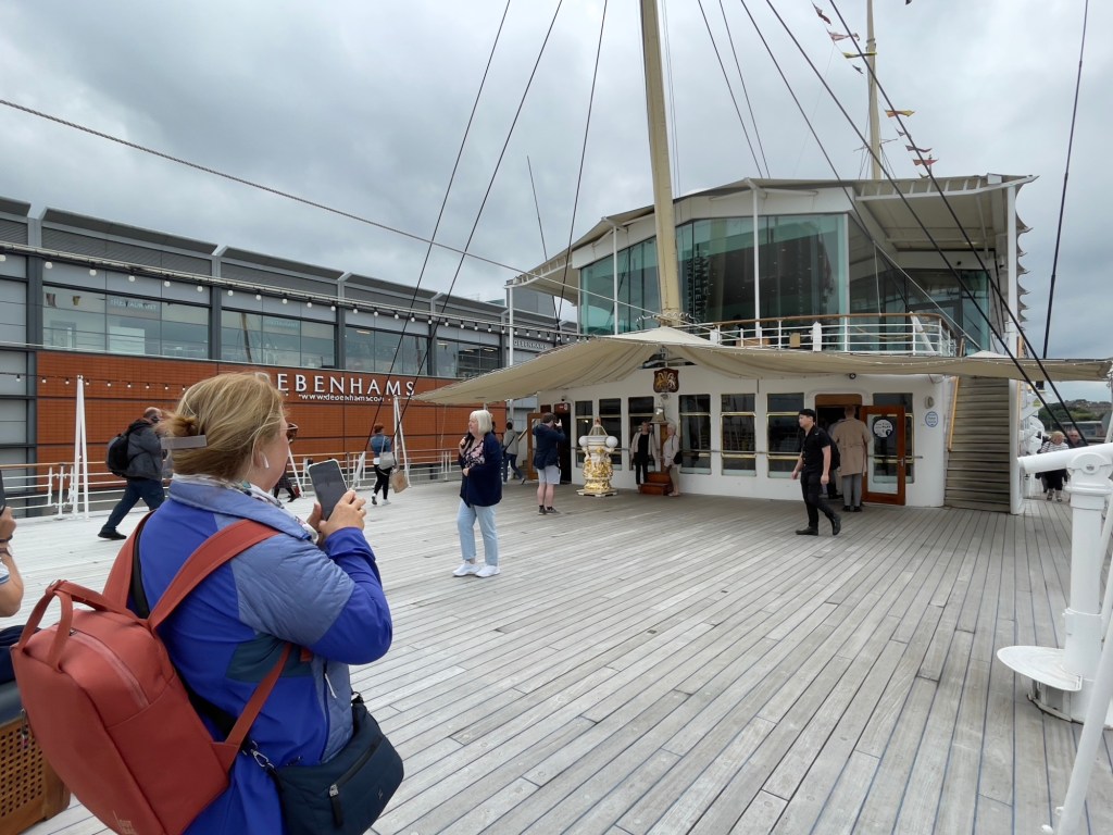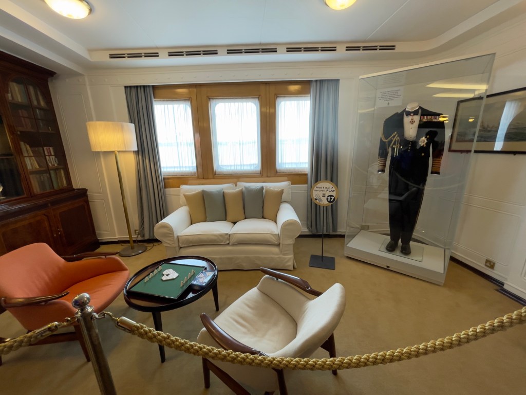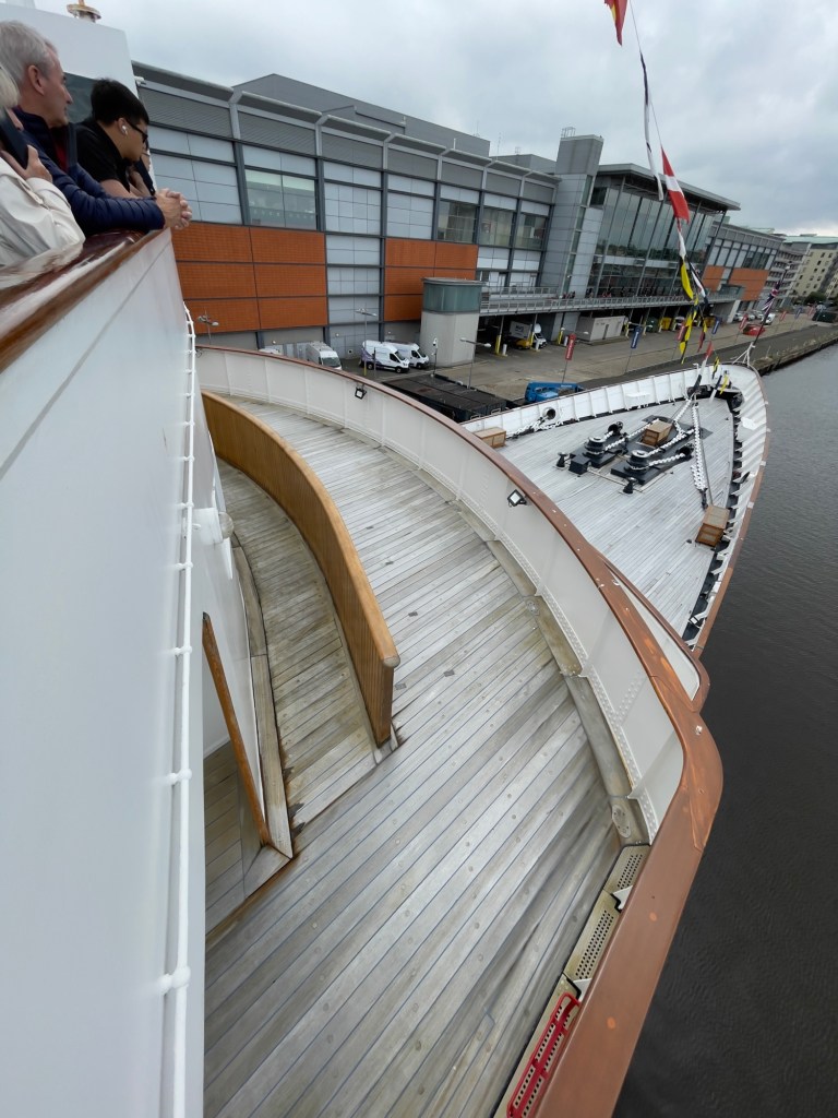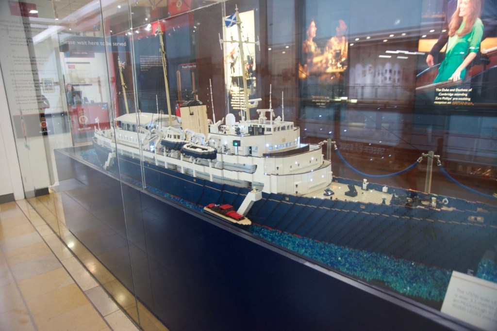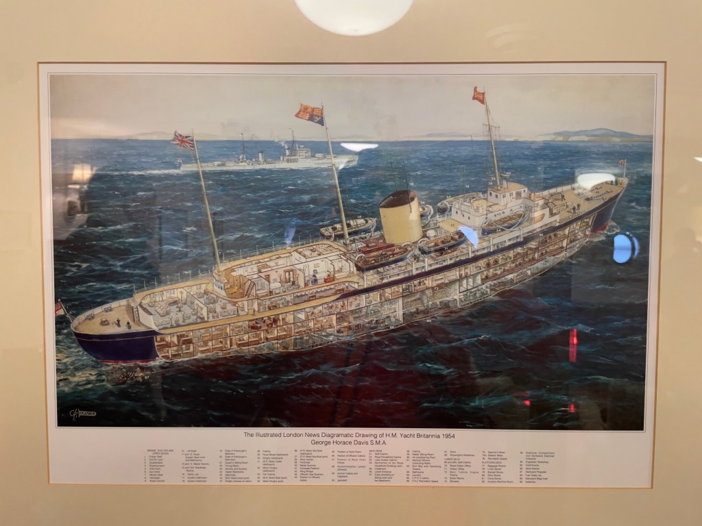 Das Ocean Terminal wird schon angekündigt.Zu erst mal dachten wir, dass man auch hier shoppen kann. Weit gefehlt – Leerstände und Geschäfte, die man nicht unbedingt braucht. Der Zugang befindet sich im 2.Obergeschoss und man wird erst mal durch die Geschichte in Bilder auf das Schiff aufmerksam gemacht.Lego lässt grüßen Bevor man aufs Schiff darf, sieht man schon den Bug.Der Zugang erfolgt über das 2.Obergeschoss und man gelangt auf die Brücke der Britannia.Brücke – der Stuhl ist nur für den AdmiralKreiselkompass Vor der Holzwand standen die Queen beim Einlaufen in den Hafen. Die kleine Holzwand ist dafür da, dass der Queen / den Damen beim Einlaufen in den Hafen die Röcke durch den Wind nicht hoch geweht werden kann.Hinter der Brücke befindet sich der Flaggenschrank.Blick in Richtung Heck des SchiffesBlick in die Kajüte des AdmiralEs musste früher immer der Land Rover der Queen mitgenommen werden. Danach kam der Rolls-Royce mit, allerdings mussten immer die Stoßstangen abmontiert werden, damit dieser in diese Position passte. Zum Schluss wurde kein Fahrzeug mitgenommen, sondern man hat auf die Fahrzeuge vor Ort am Ziel zurückgegriffen.Das Deck der königlichen Familie.Auf diesem Deck wurden auch offizielle Bilder aufgenommen.Die Planken bestehen aus 5 cm dicken Teakholz, die täglich mit Meerwasser gesäubert werden musste.Der Lieblingsraum der Queen und des Prinzen. Rechts hinter der Wand Spiele oder Plattenspieler Spieleschrankund links die Bar.