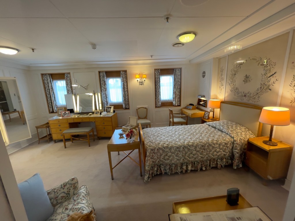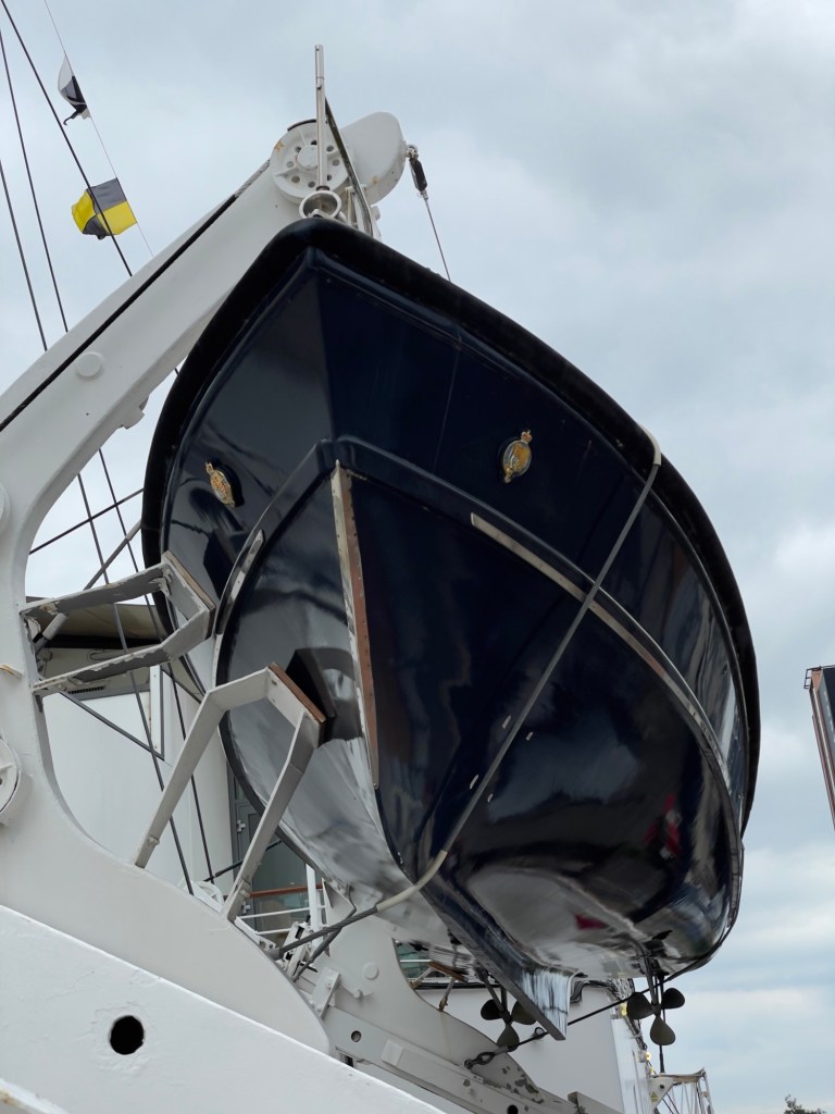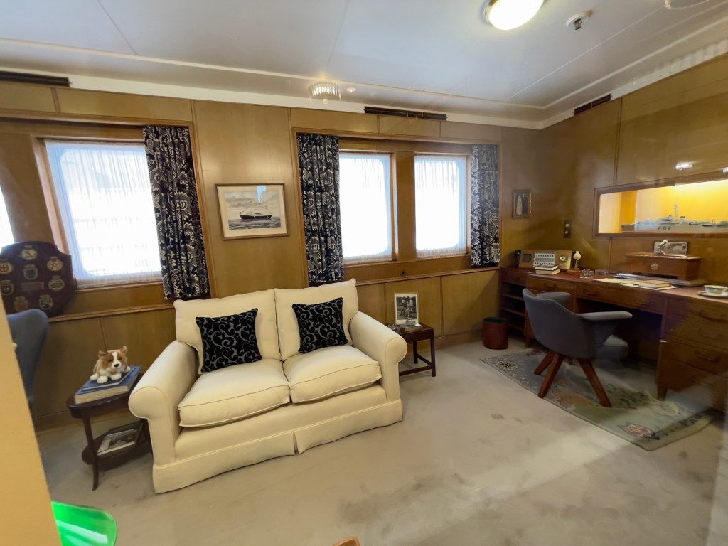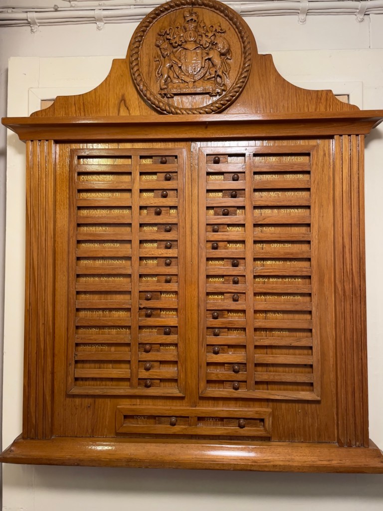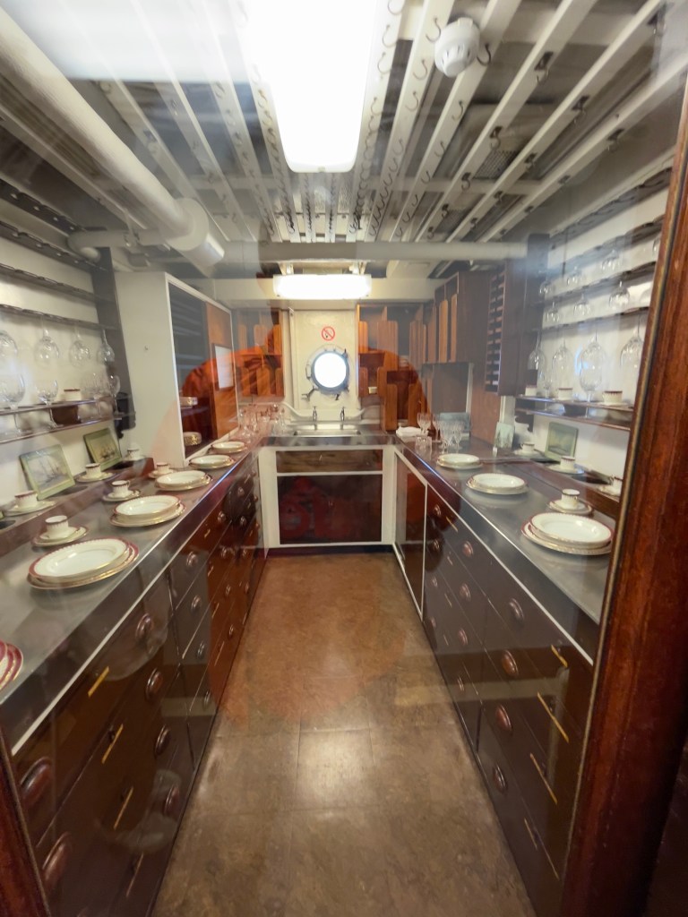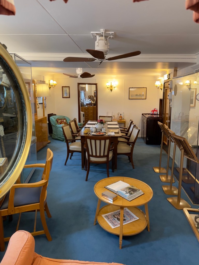 Neben den normalen Beibooten sind zwei Motorboote dabei. Zusätzlich war die königliche Barkasse an Board.Königliche BarkasseZeigte an wer an Land war oder an BoardOffiziersmesse der oberen Diensträngedazugehörende BarOffiziersmesse – hier gab es streng regeln fürs Dinner: weißes Hemd, schwarze Hose mit Kummerbund. Zum Schluss Salut auf die Queen und PrinzgemahlKombüse für OffiziereKombüse für,die königliche Familie. Die Köche des Buckingham Palastes waren immer dabeiSpeisesaal der königlichen Familie bzw. für offizielle EssenDas Geschirr und Besteck wurde mit dem Metermaß ausgerichtetZusätzlich befinden sich Geschenke von den Reiseländern in den Nischen.Arbeitszimmer der Queen Arbeitszimmer Prinz Philipp Cocktailraum mitFlügel, der am Boden festgeschraubt war.Auf diesem Deck befinden sich Offiziere und die Bediensteten des PalastesOffiziersmesse der niedrigeren DiensträngeKajütenHier ist das nicht mehr so luxuriös, aber jeder hatte ein Bett. Bis in die siebziger Jahre soll es noch Hängematten gegeben haben.Ein Teil der Mannschaft war auch in der königliche Kapelle. Es wurde täglich geprobt und der Proberaum musste weit genug von den königlichen Räumen entfernt sein.Lazarett – OP gab es auchWäscherei MaschinenraumArbeitsraumWaschraum für die Mannschaft Zugang für die königliche FmilieFür die Crew