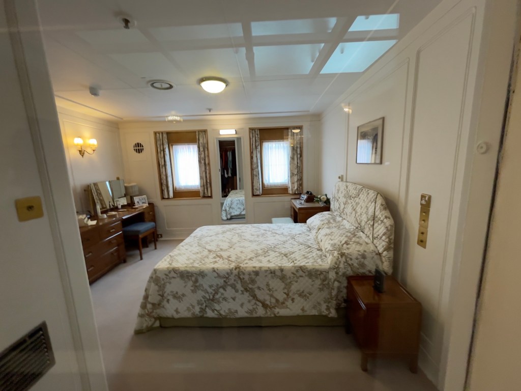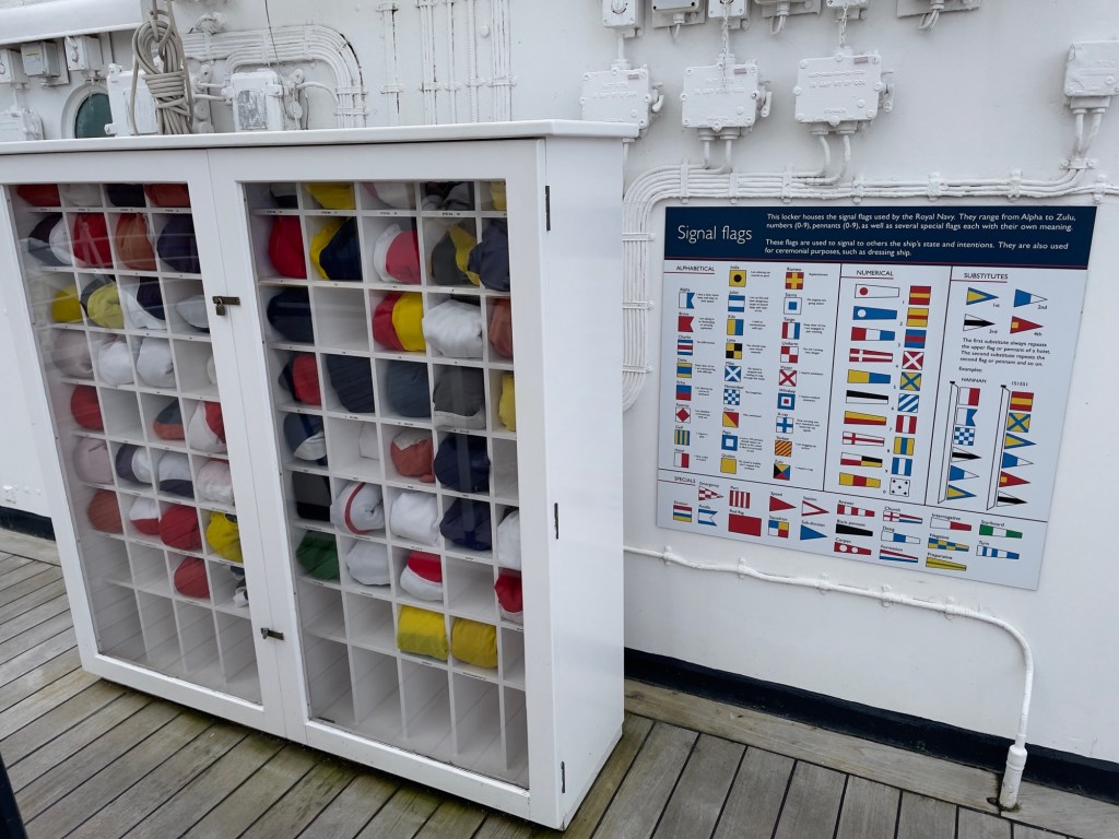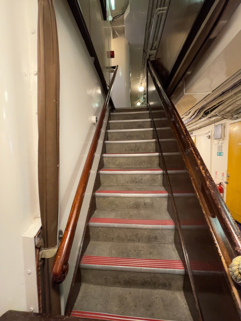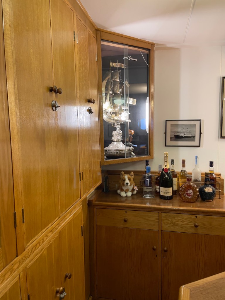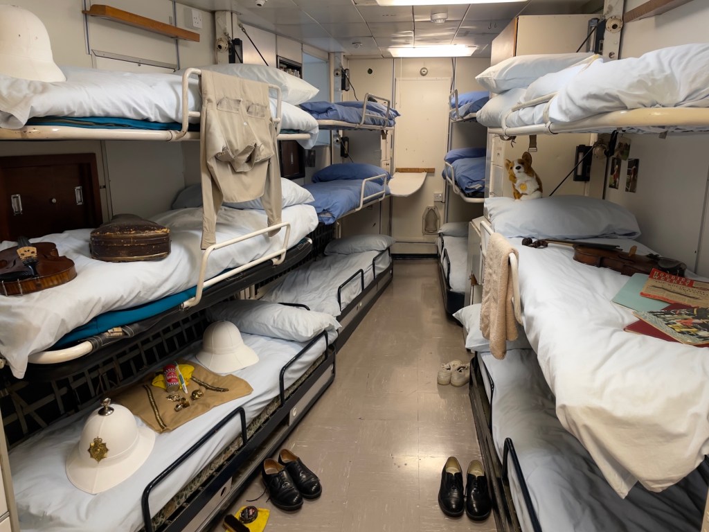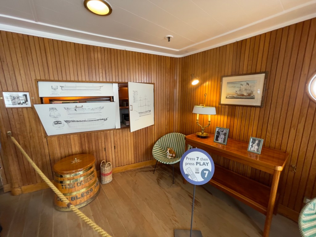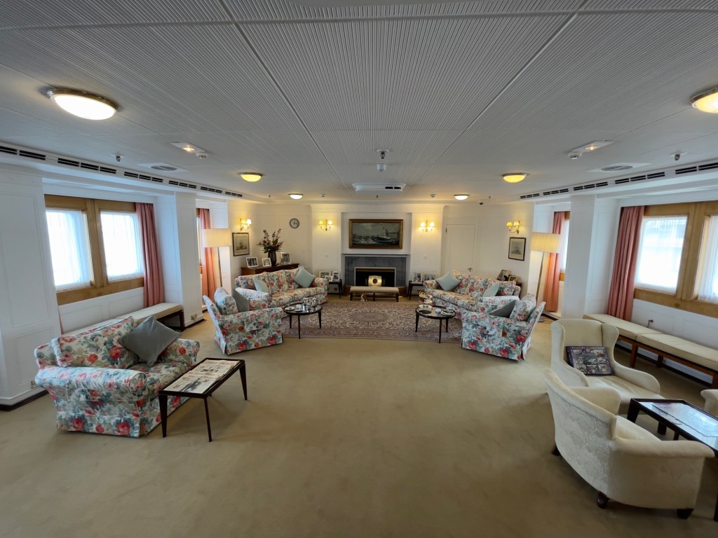 Neben den normalen Beibooten sind zwei Motorboote dabei. Zusätzlich war die königliche Barkasse an Board.Königliche BarkasseZeigte an wer an Land war oder an BoardOffiziersmesse der oberen Diensträngedazugehörende BarOffiziersmesse – hier gab es streng regeln fürs Dinner: weißes Hemd, schwarze Hose mit Kummerbund. Zum Schluss Salut auf die Queen und PrinzgemahlKombüse für OffiziereKombüse für,die königliche Familie. Die Köche des Buckingham Palastes waren immer dabeiSpeisesaal der königlichen Familie bzw. für offizielle EssenDas Geschirr und Besteck wurde mit dem Metermaß ausgerichtetZusätzlich befinden sich Geschenke von den Reiseländern in den Nischen.Arbeitszimmer der Queen Arbeitszimmer Prinz Philipp Cocktailraum mitFlügel, der am Boden festgeschraubt war.Auf diesem Deck befinden sich Offiziere und die Bediensteten des PalastesOffiziersmesse der niedrigeren DiensträngeKajütenHier ist das nicht mehr so luxuriös, aber jeder hatte ein Bett. Bis in die siebziger Jahre soll es noch Hängematten gegeben haben.Ein Teil der Mannschaft war auch in der königliche Kapelle. Es wurde täglich geprobt und der Proberaum musste weit genug von den königlichen Räumen entfernt sein.Lazarett – OP gab es auchWäscherei MaschinenraumArbeitsraumWaschraum für die Mannschaft Zugang für die königliche FmilieFür die Crew