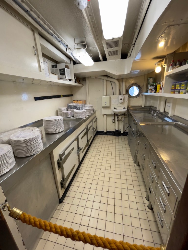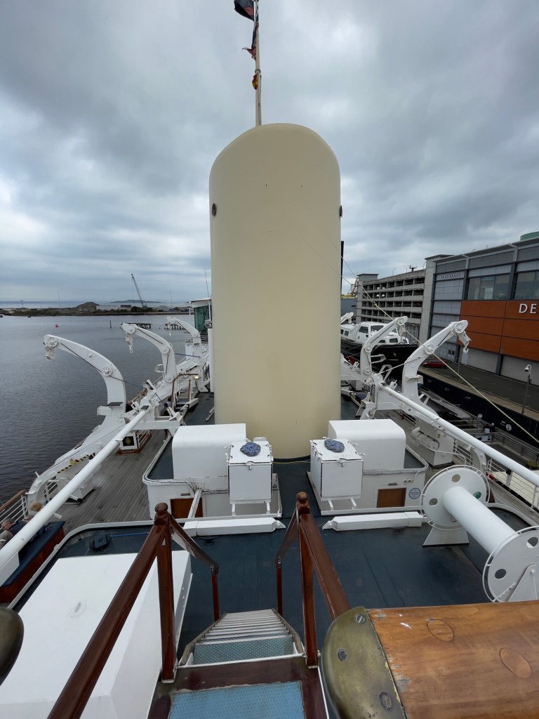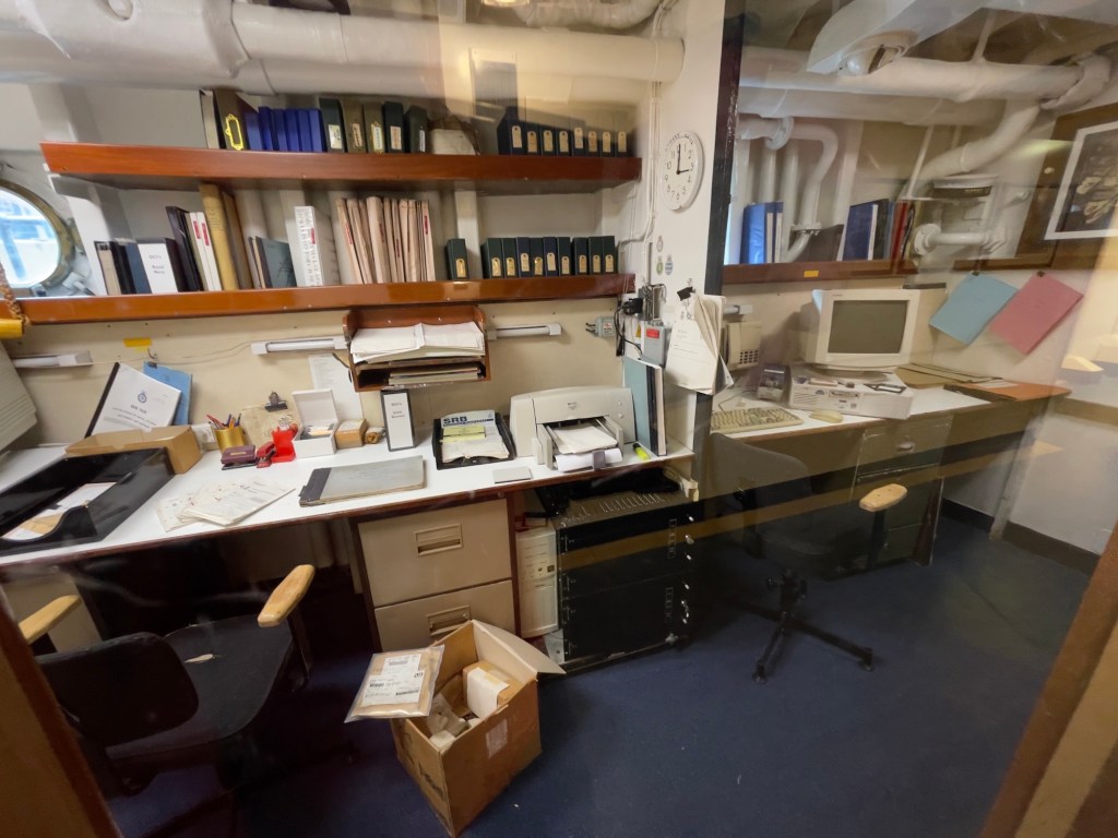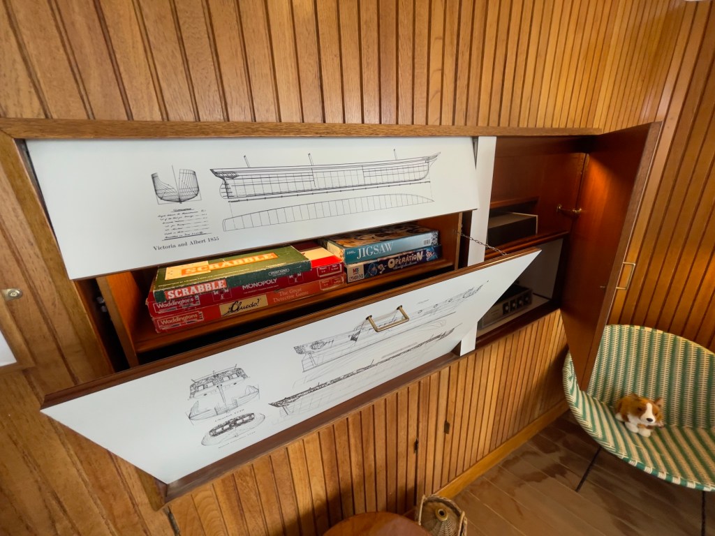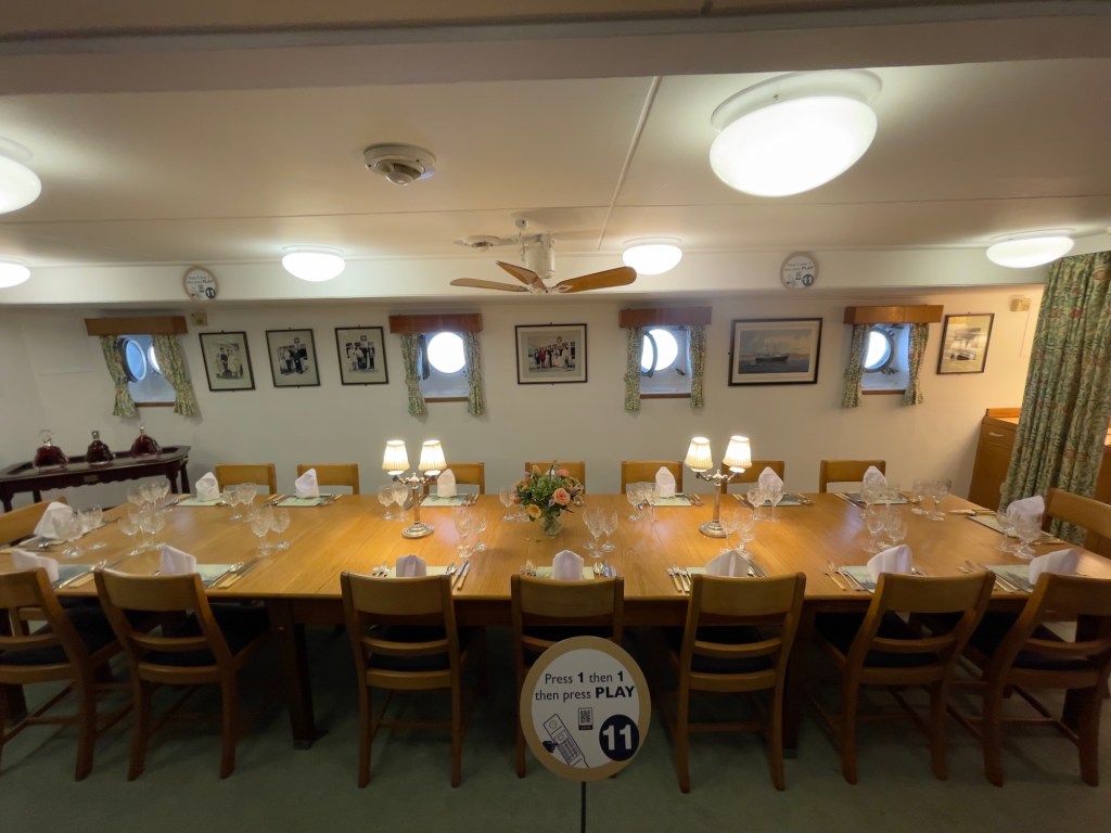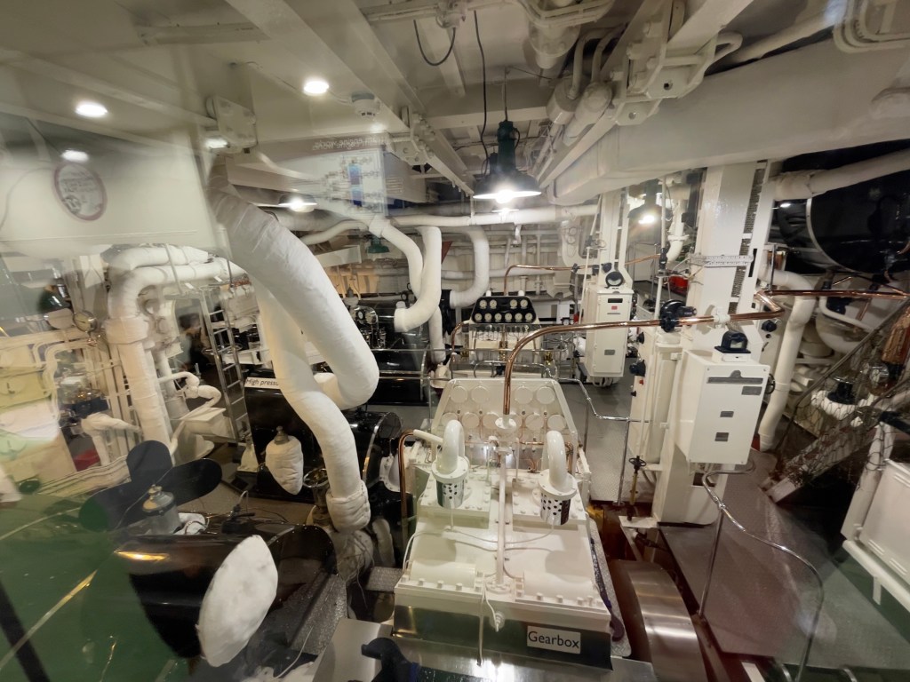 Neben den normalen Beibooten sind zwei Motorboote dabei. Zusätzlich war die königliche Barkasse an Board.Königliche BarkasseZeigte an wer an Land war oder an BoardOffiziersmesse der oberen Diensträngedazugehörende BarOffiziersmesse – hier gab es streng regeln fürs Dinner: weißes Hemd, schwarze Hose mit Kummerbund. Zum Schluss Salut auf die Queen und PrinzgemahlKombüse für OffiziereKombüse für,die königliche Familie. Die Köche des Buckingham Palastes waren immer dabeiSpeisesaal der königlichen Familie bzw. für offizielle EssenDas Geschirr und Besteck wurde mit dem Metermaß ausgerichtetZusätzlich befinden sich Geschenke von den Reiseländern in den Nischen.Arbeitszimmer der Queen Arbeitszimmer Prinz Philipp Cocktailraum mitFlügel, der am Boden festgeschraubt war.Auf diesem Deck befinden sich Offiziere und die Bediensteten des PalastesOffiziersmesse der niedrigeren DiensträngeKajütenHier ist das nicht mehr so luxuriös, aber jeder hatte ein Bett. Bis in die siebziger Jahre soll es noch Hängematten gegeben haben.Ein Teil der Mannschaft war auch in der königliche Kapelle. Es wurde täglich geprobt und der Proberaum musste weit genug von den königlichen Räumen entfernt sein.Lazarett – OP gab es auchWäscherei MaschinenraumArbeitsraumWaschraum für die Mannschaft Zugang für die königliche FmilieFür die Crew