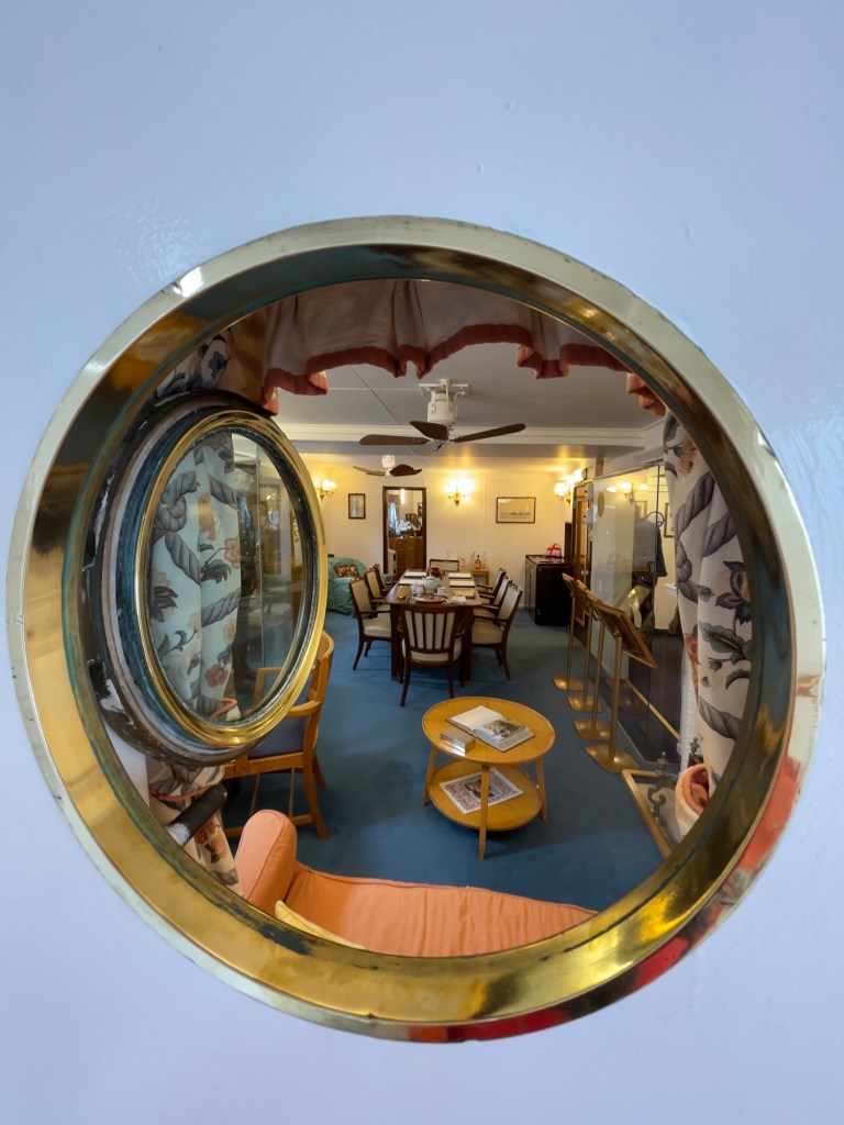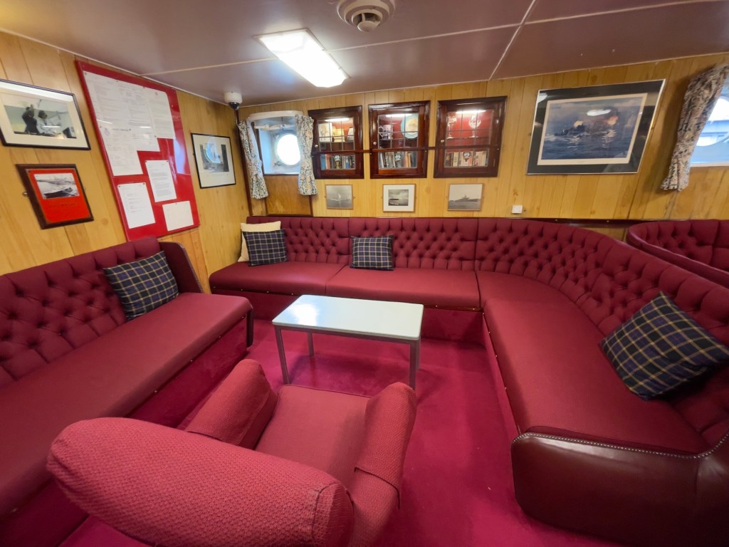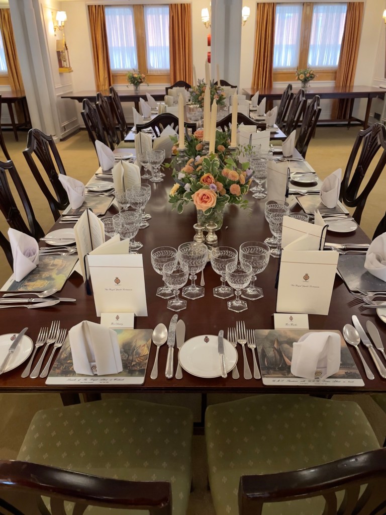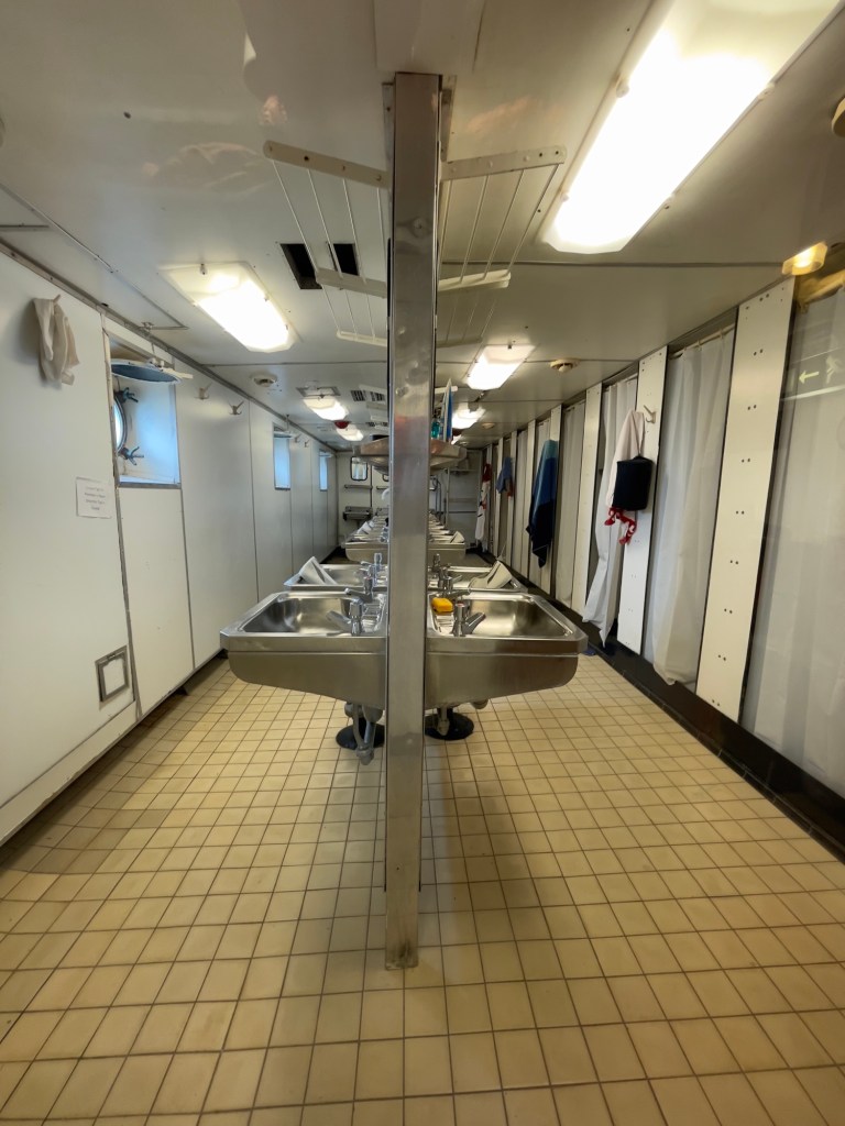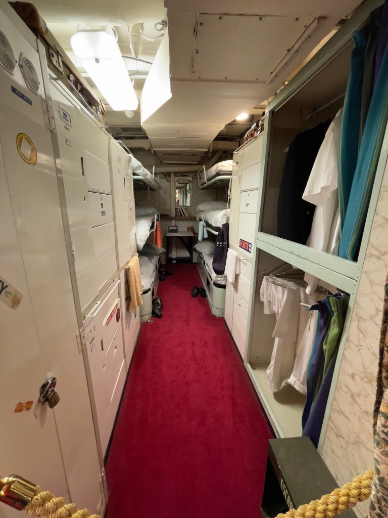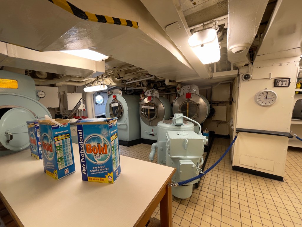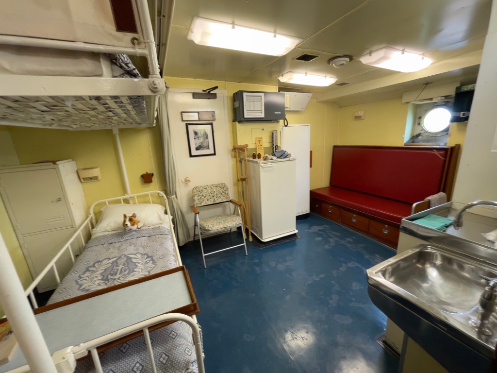 Neben den normalen Beibooten sind zwei Motorboote dabei. Zusätzlich war die königliche Barkasse an Board.Königliche BarkasseZeigte an wer an Land war oder an BoardOffiziersmesse der oberen Diensträngedazugehörende BarOffiziersmesse – hier gab es streng regeln fürs Dinner: weißes Hemd, schwarze Hose mit Kummerbund. Zum Schluss Salut auf die Queen und PrinzgemahlKombüse für OffiziereKombüse für,die königliche Familie. Die Köche des Buckingham Palastes waren immer dabeiSpeisesaal der königlichen Familie bzw. für offizielle EssenDas Geschirr und Besteck wurde mit dem Metermaß ausgerichtetZusätzlich befinden sich Geschenke von den Reiseländern in den Nischen.Arbeitszimmer der Queen Arbeitszimmer Prinz Philipp Cocktailraum mitFlügel, der am Boden festgeschraubt war.Auf diesem Deck befinden sich Offiziere und die Bediensteten des PalastesOffiziersmesse der niedrigeren DiensträngeKajütenHier ist das nicht mehr so luxuriös, aber jeder hatte ein Bett. Bis in die siebziger Jahre soll es noch Hängematten gegeben haben.Ein Teil der Mannschaft war auch in der königliche Kapelle. Es wurde täglich geprobt und der Proberaum musste weit genug von den königlichen Räumen entfernt sein.Lazarett – OP gab es auchWäscherei MaschinenraumArbeitsraumWaschraum für die Mannschaft Zugang für die königliche FmilieFür die Crew