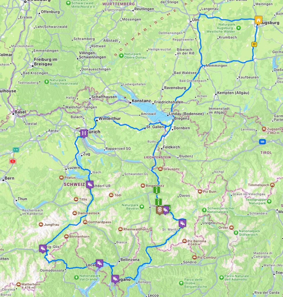 Unsere Tour durch die Schweiz führt uns in die Kantone Graubünden, Tessin, Wallis und über die Zentralschweiz wieder nach Hause.