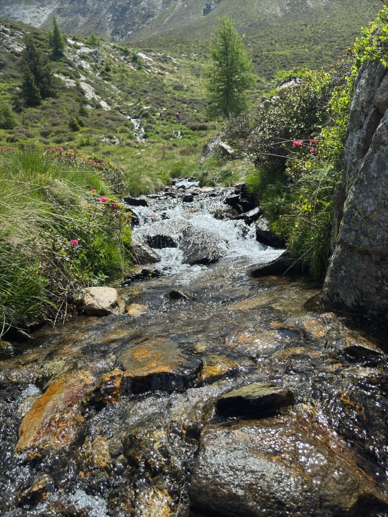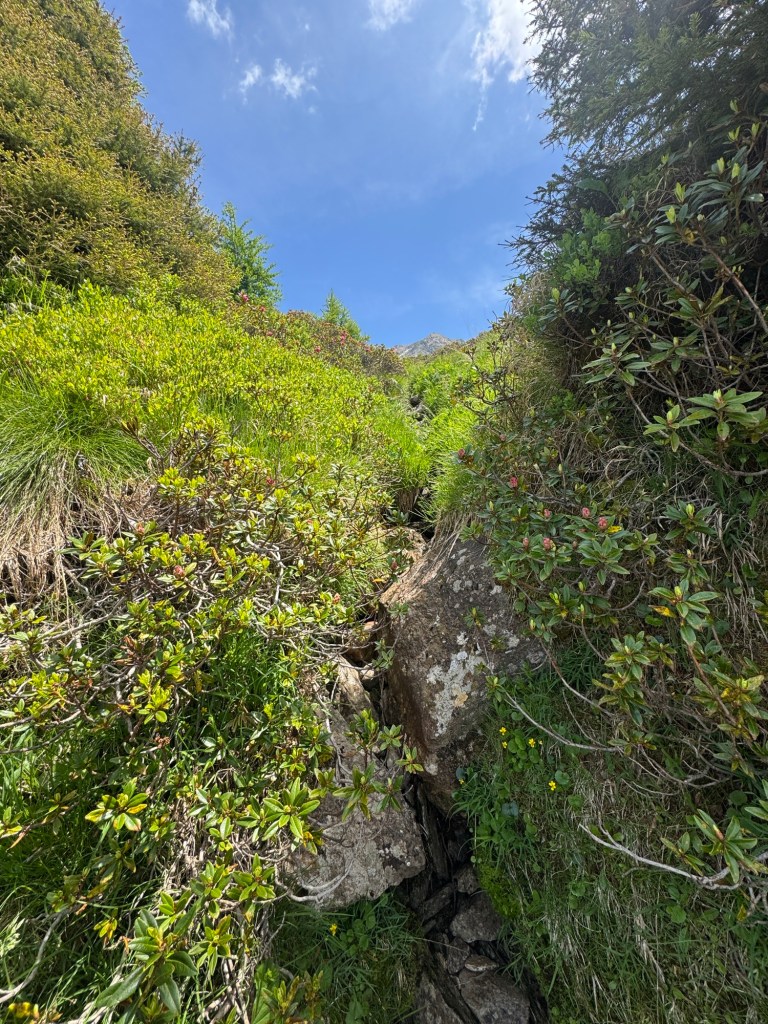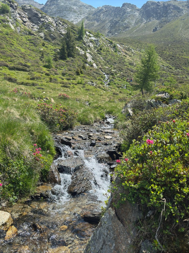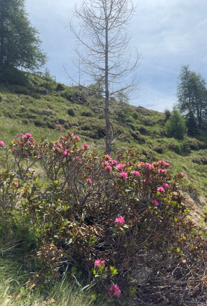 Ein gemütlicher Weg entlang an blühenden Alpenrosen.