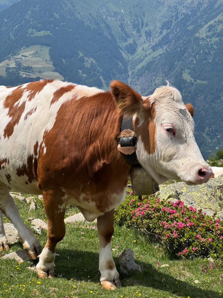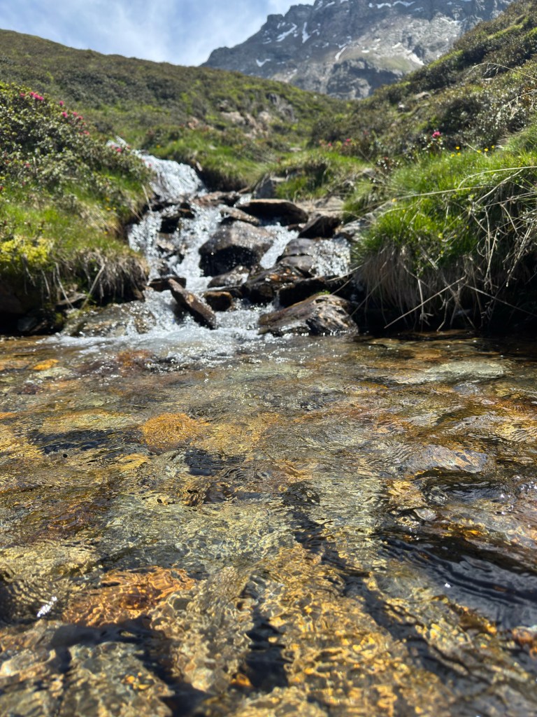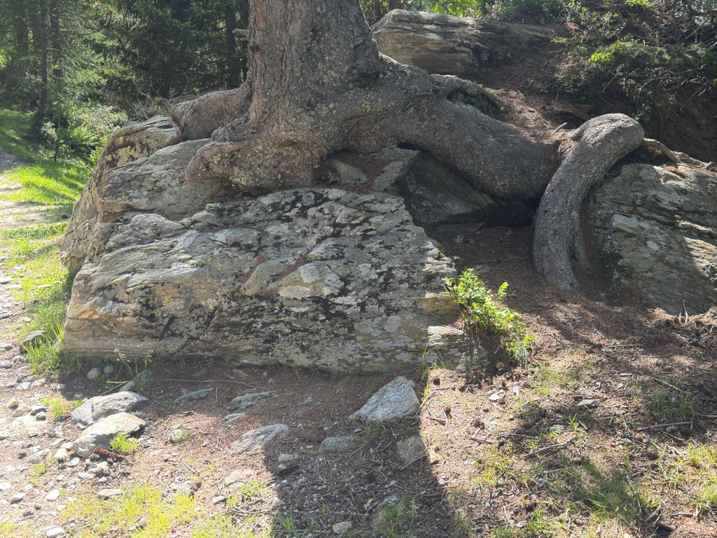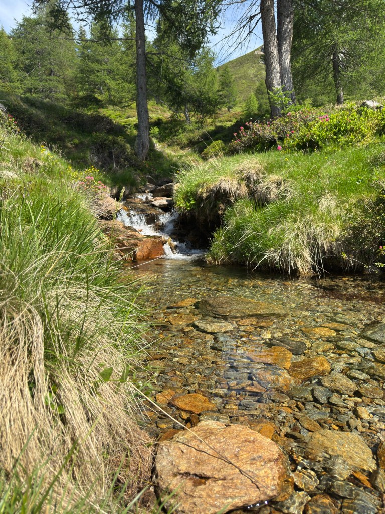 Ein gemütlicher Weg entlang an blühenden Alpenrosen.