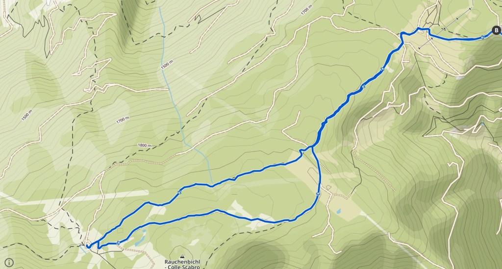 Am Fuße der kleinen Kapelle (Gasthof Jocher) weiter über gut ausgebauten Wegen teils im Wald in Richtung Naturnser Alm.