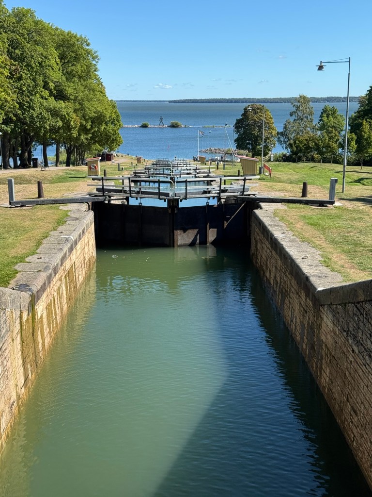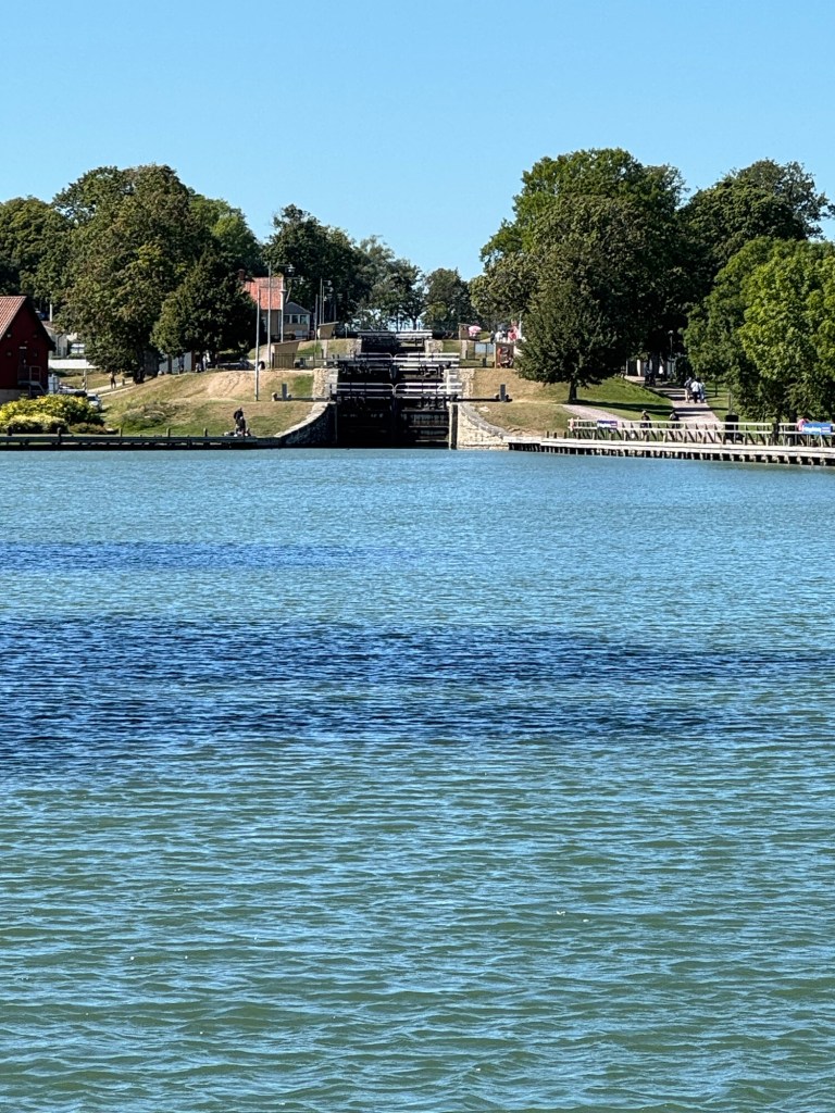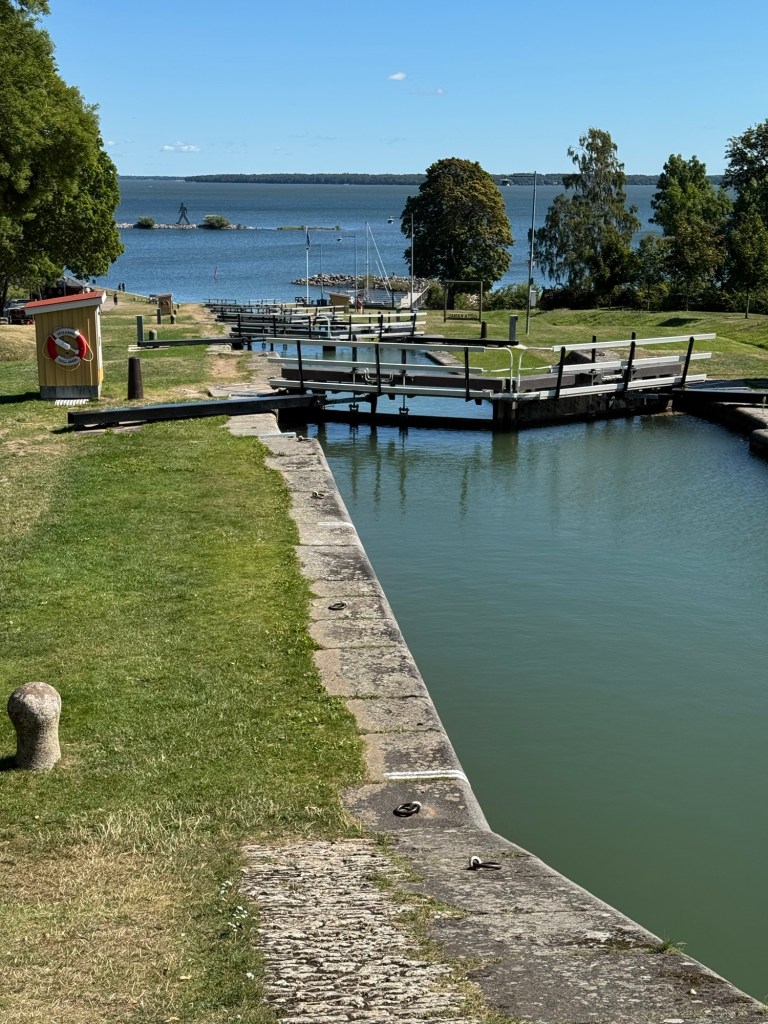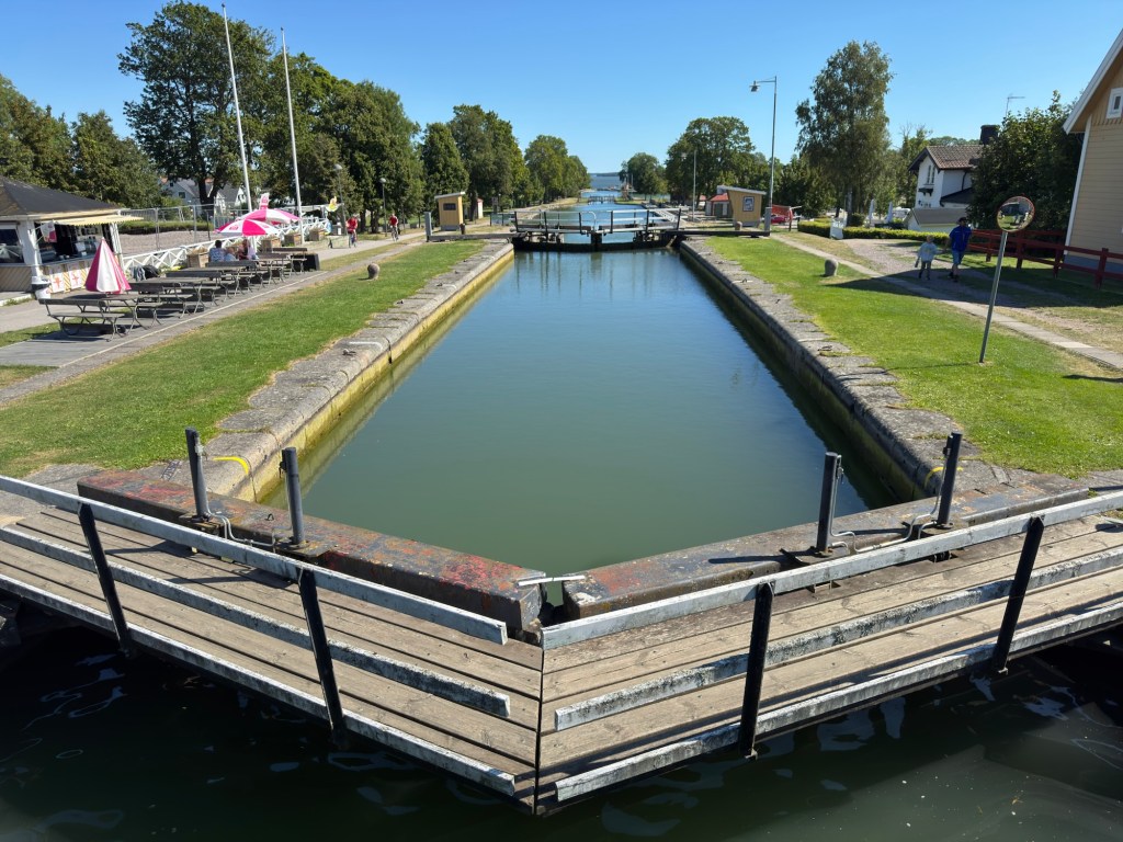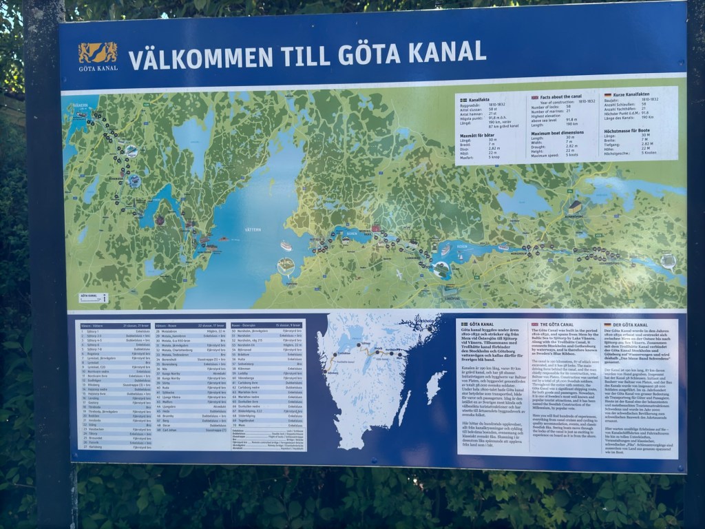 Hier in Berg überwindet der Kanal mit Hilfe von sieben Schleusen („Carl Johans slussar“) fast 20 Höhenmeter. Mit den zwei nachfolgenden Doppelschleusen sind es sogar fast 30 Höhenmeter.