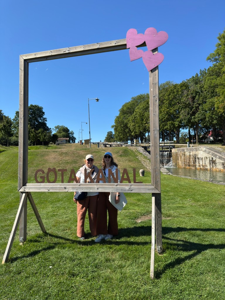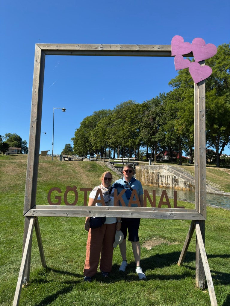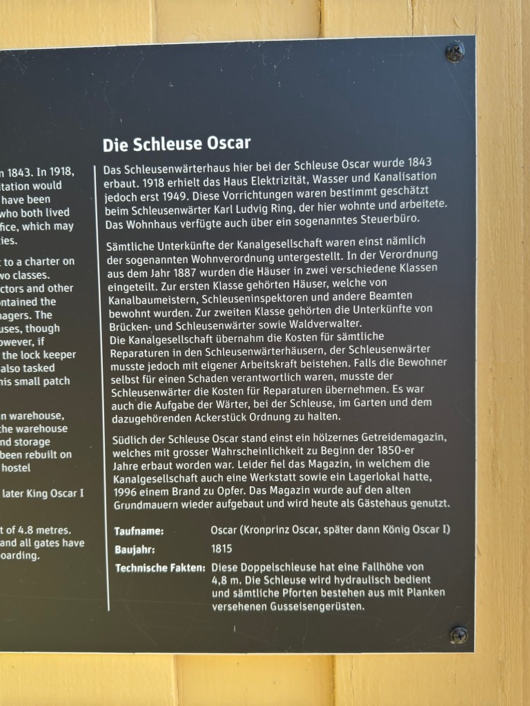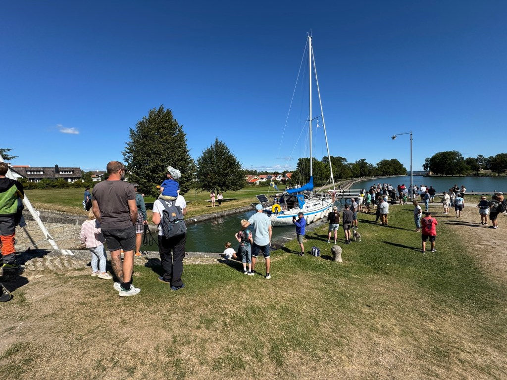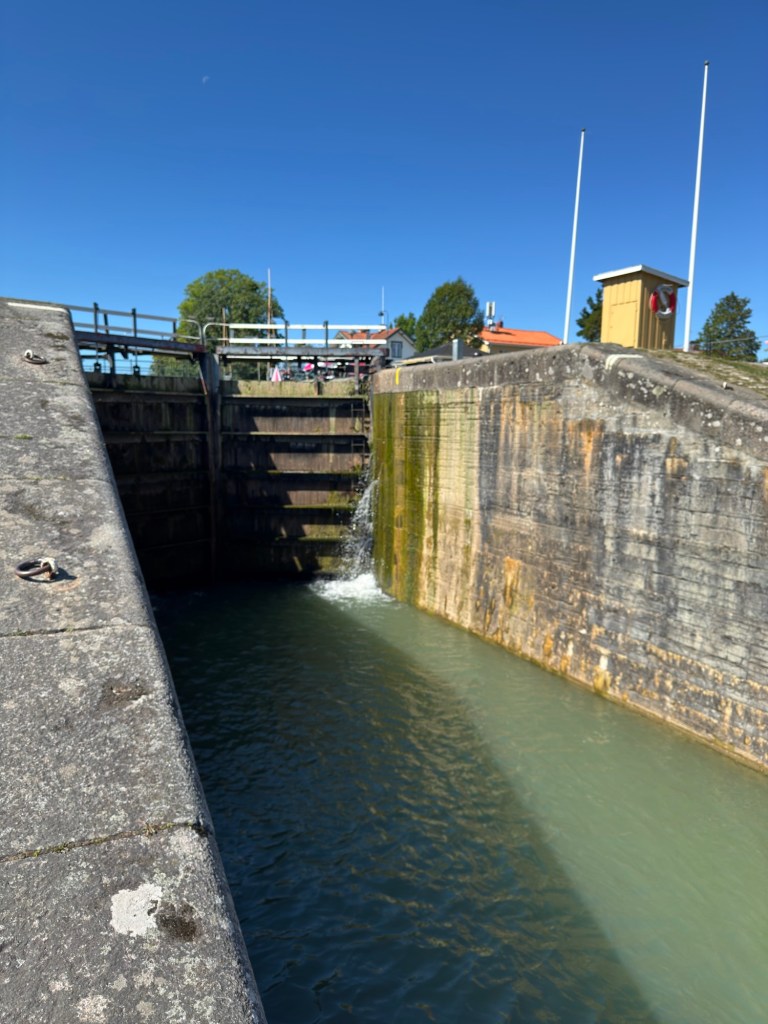 Hier in Berg überwindet der Kanal mit Hilfe von sieben Schleusen („Carl Johans slussar“) fast 20 Höhenmeter. Mit den zwei nachfolgenden Doppelschleusen sind es sogar fast 30 Höhenmeter.