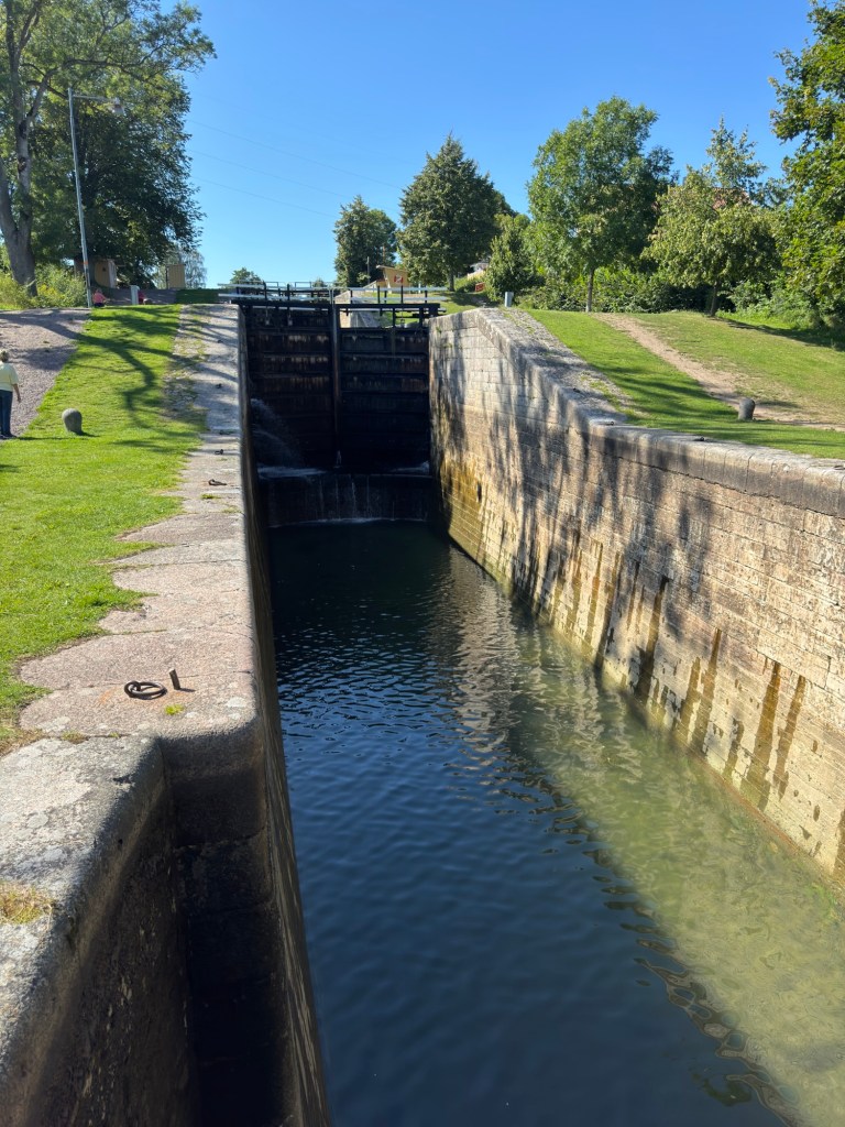 Unten warten schon die Gänse und Enten…Die zu überwindende Höhe kann man gar nicht genau erkennen, aber wie beschrieben sind 15m zu überwinden.Gegenüber den anderen Schleusen muss hier die meiste Höhe überwunden werden.SchleusentorDie Straßenbrücke wird nicht angehoben, sondern zur Seite geschoben.Blick zum Göta-Kanal